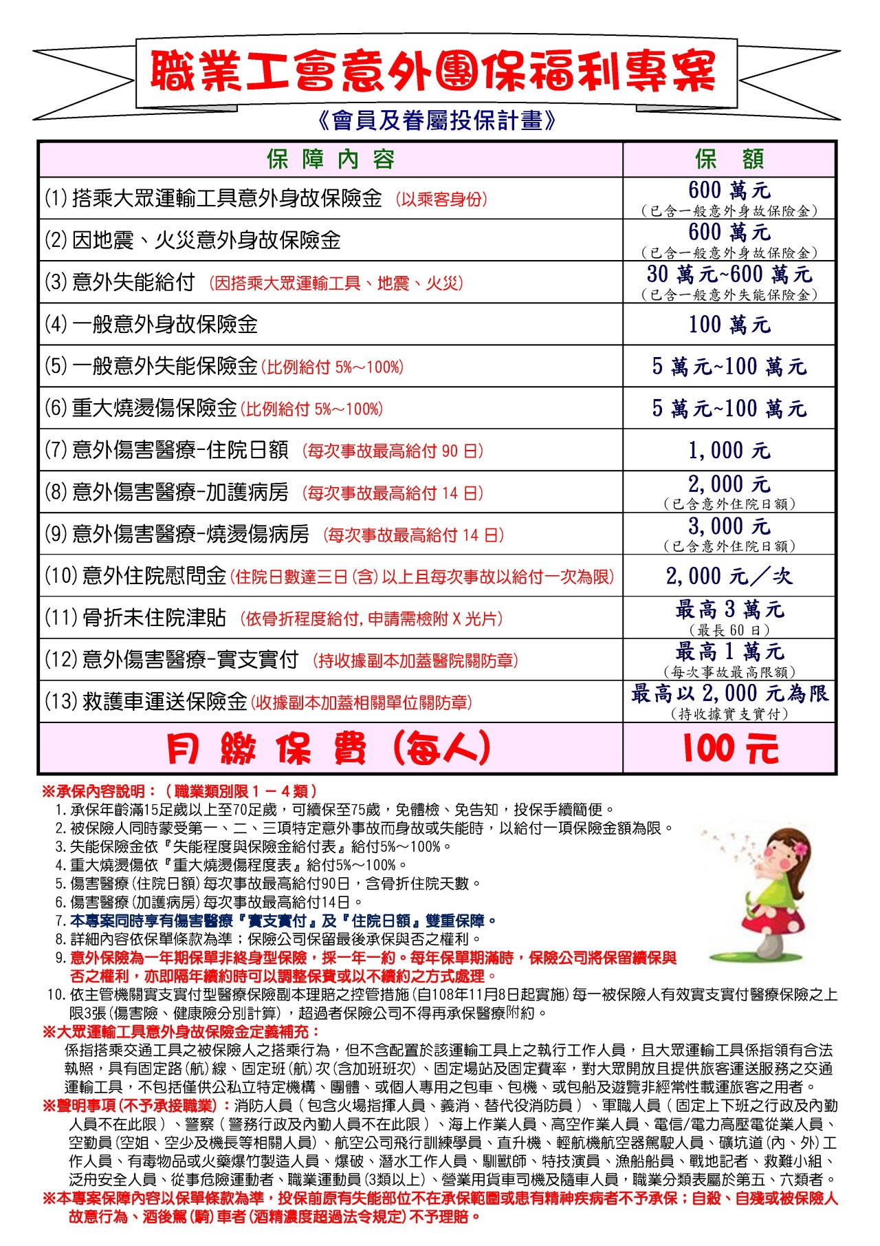 113年團保意外險 因保險公司調整方案,自四月起己加保團保之會員保險費變更為100元理賠方案給付內容也有所調整, 詳細內容請參照下方資訊。 本會與興華保險代理人(股)公司合作辦理「工會團體意外險600萬專案」,意者請加入官方line洽詢