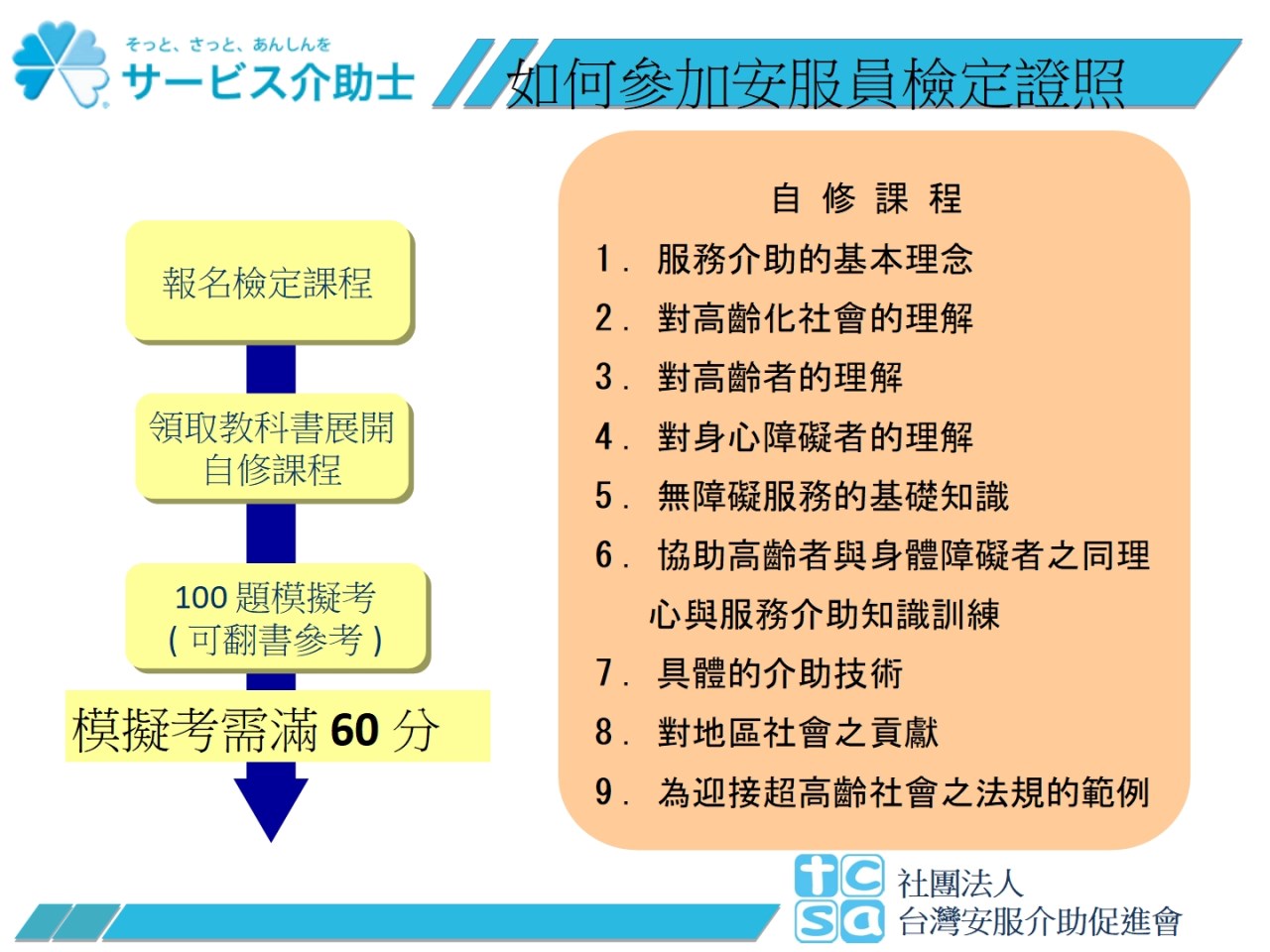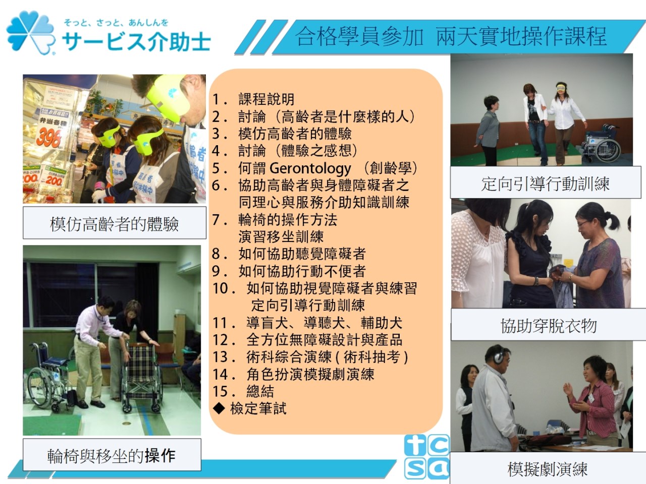 化所帶來的不便,進而理解高齡者的需求,並學習安心且安全的介助技術,學習完成並通過筆試就能