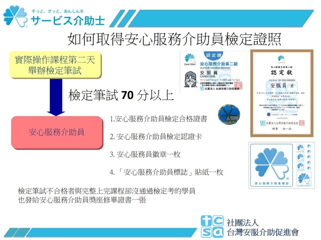 而安服員證照就是公益財團法人 日本Care Fit共育機構所規劃認證的,是讓各行各業有意願發展銀髮商