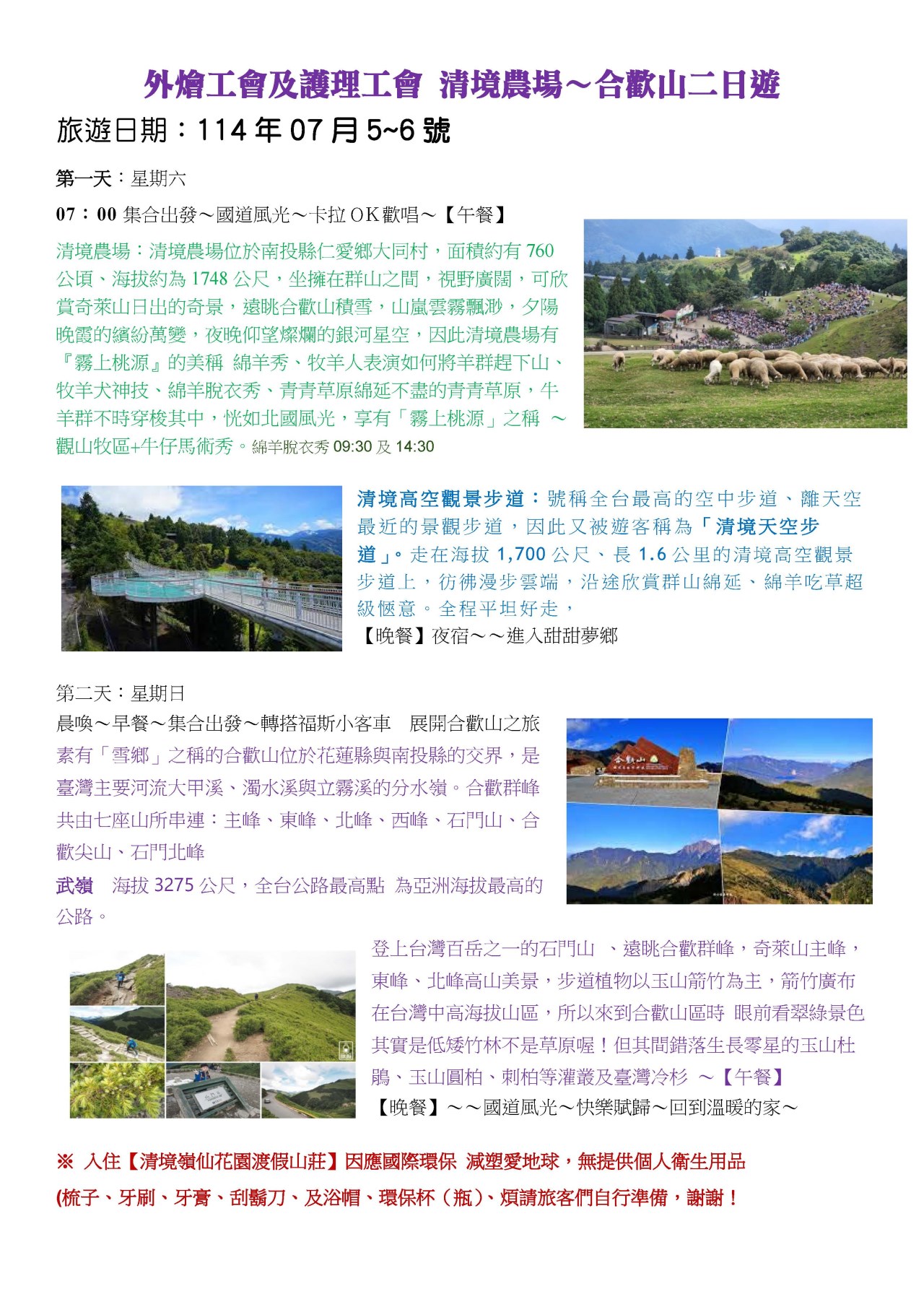 外燴工會及護理工會 旅遊日期:114年7月 5日~6日