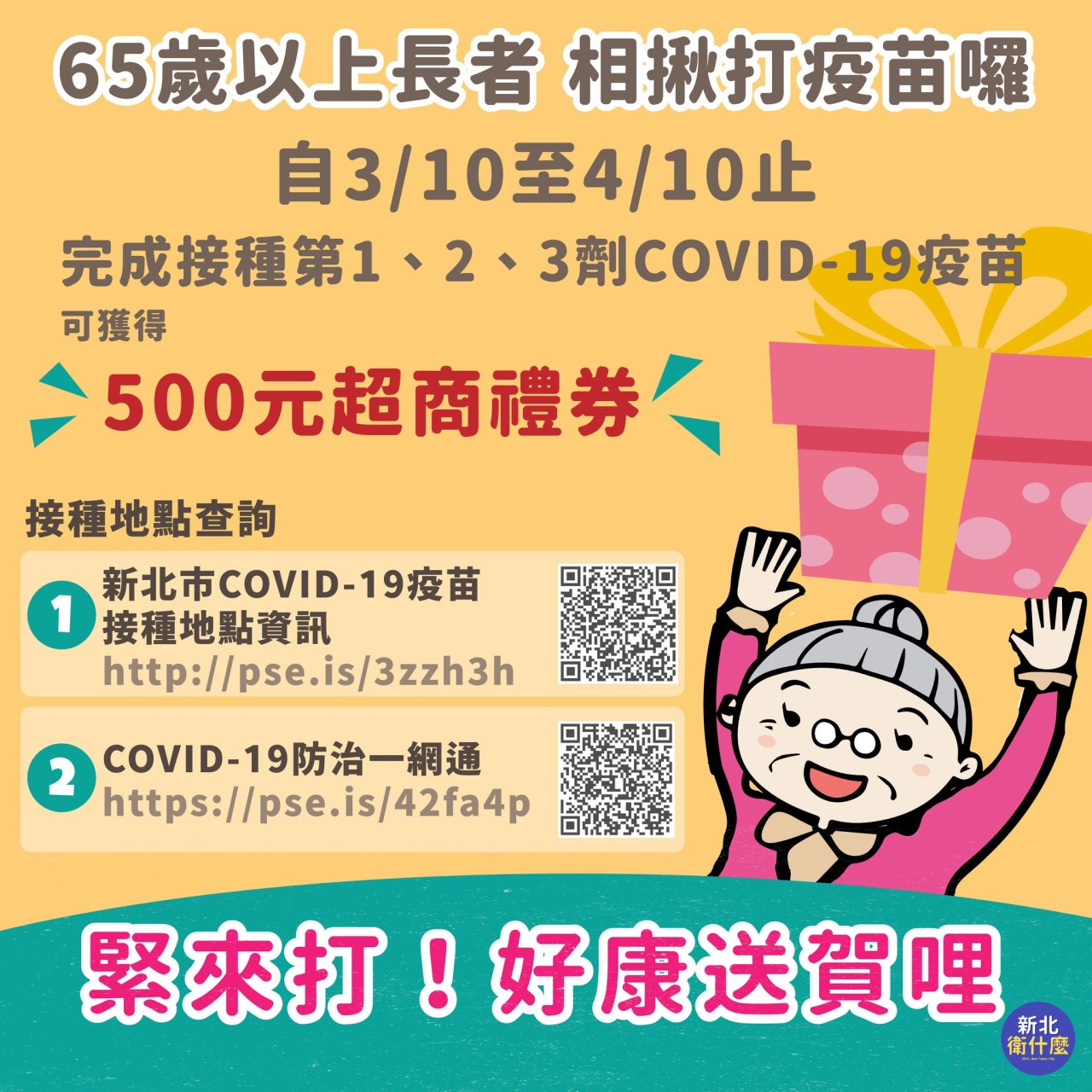 #65歲以上長者 只要在3/10-4/10期間完成接種第1、2、3劑COVID-19疫苗