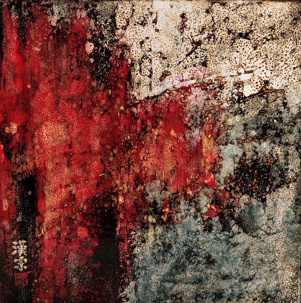 源於天文地貌觀察之體會,以塊面、線條,藉鎢金釉與彩的強烈效果,抽象表現大地裂縫肌理的獨特美感。