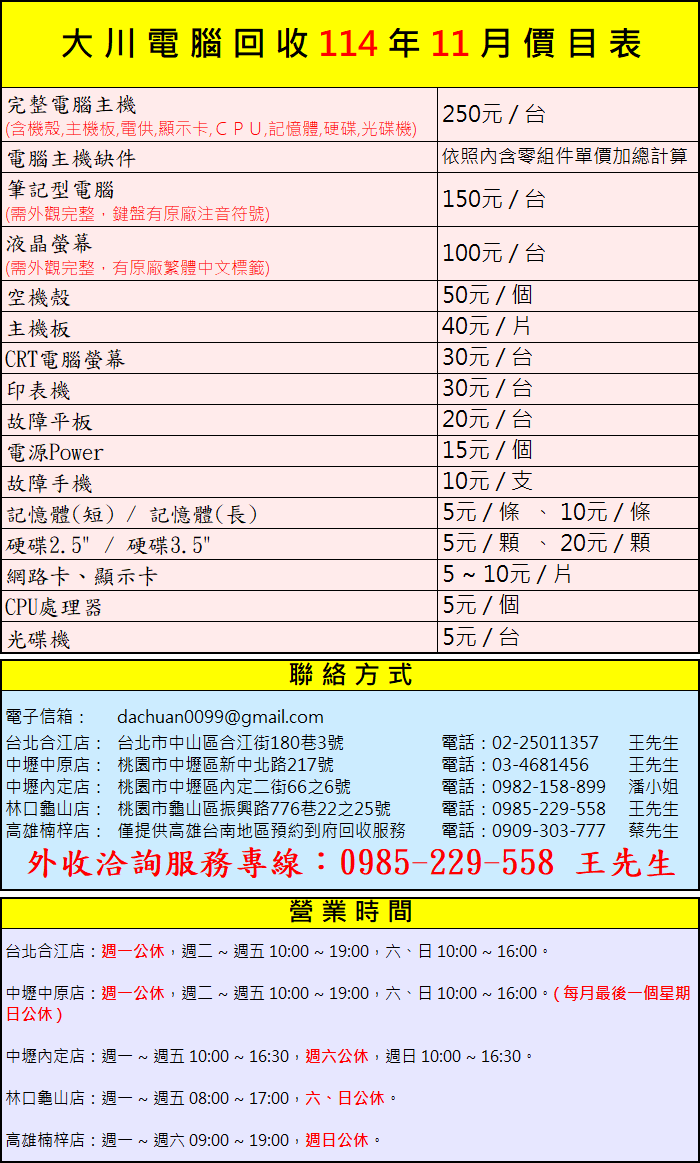 高雄楠梓站星期一~星期六09:00~19:00、每周日固定店休,高雄台南預約回收專線:0909303777蔡先生