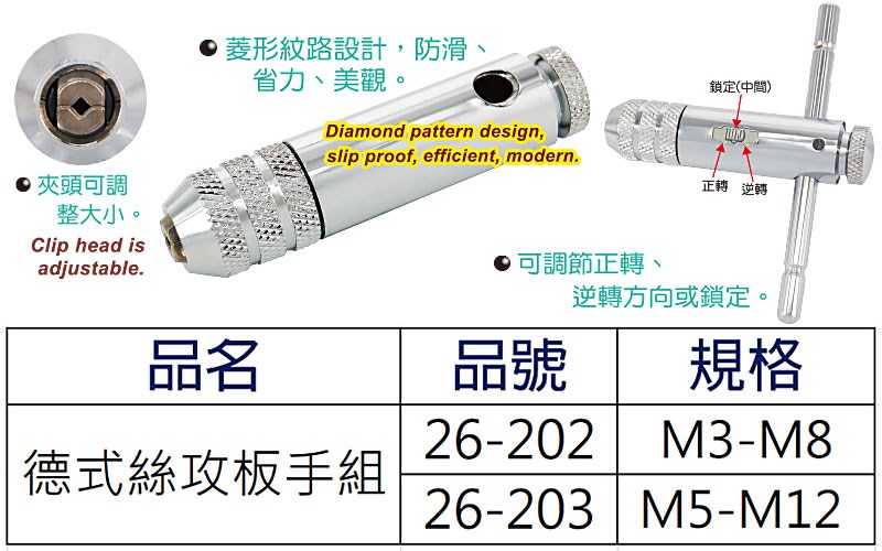 主要用途: ●棘輪式可調正、逆轉絲攻板手,是攻牙最佳幫手。 產品特色: ●可調整夾頭大小,放入合適絲錐使用。 ●可依需求單手即可操作調整正、逆或鎖定。 ●助力杆可拆卸方便收納。 產品材質:碳鋼。