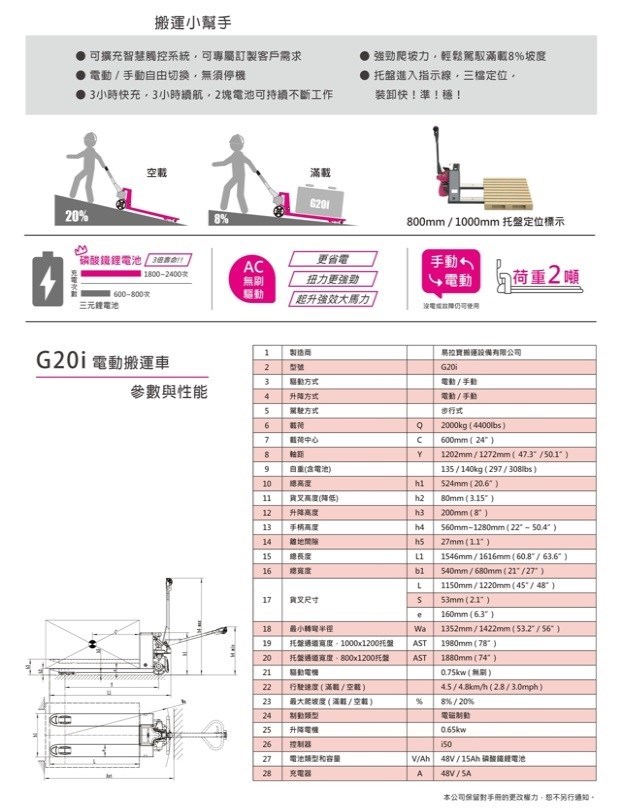 OKGO G20i-2.0噸 電動/手動拖板車 規格表