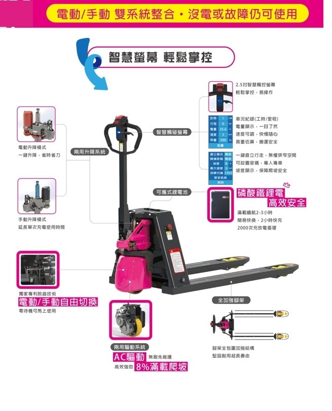 電動/手動拖板車,雙系統整合,沒電或故障仍可使用。