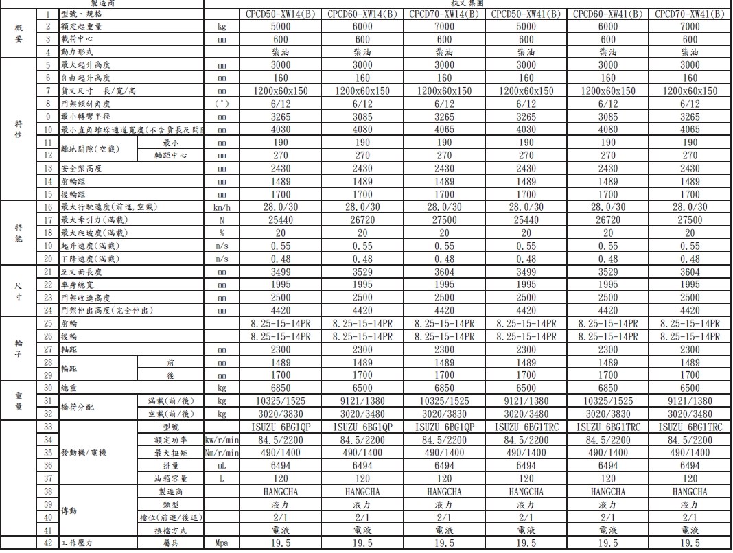 HANGCHA-XF系列 5.0-7.0噸柴油堆高機 規格表