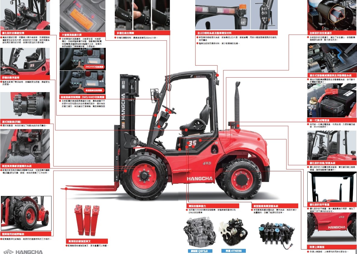 HANGCHA 杭叉2.5-3.5噸越野堆高機在XF系列柴油堆高機的基礎上開發而成,採用多項新技術設計,通過技術創新,全面提升整車可靠性、安全性、外觀、舒適性、易維護等性能。