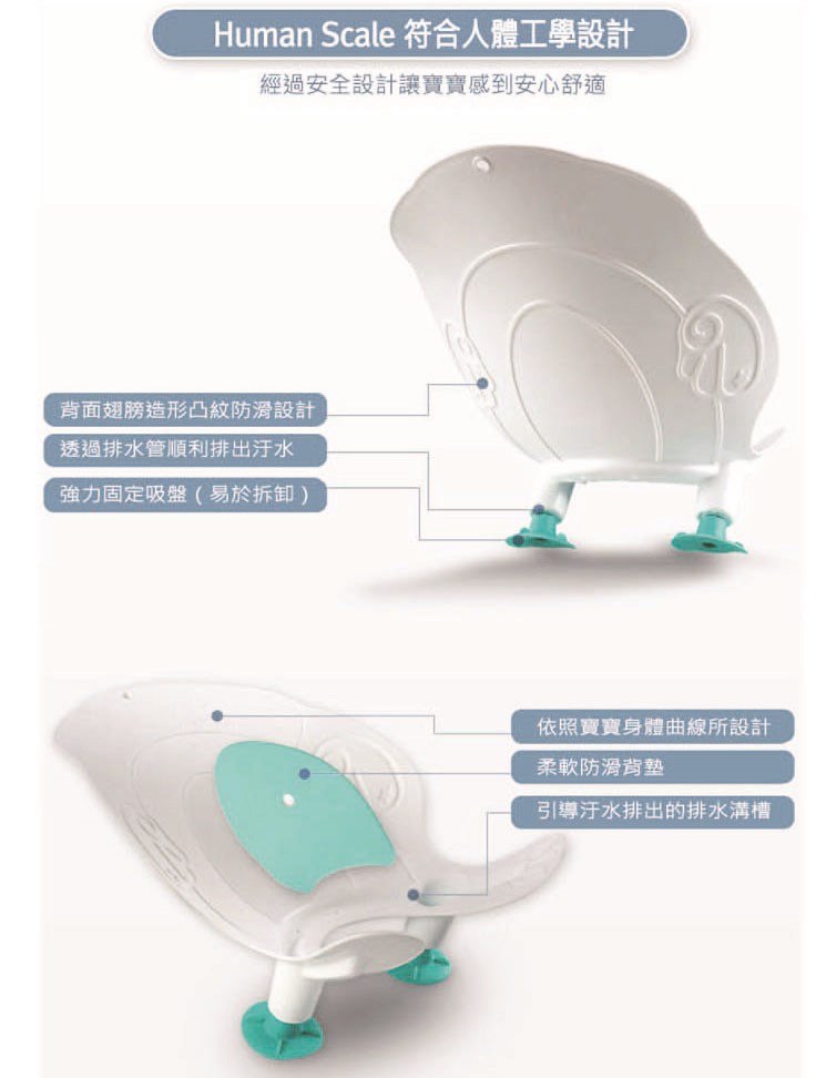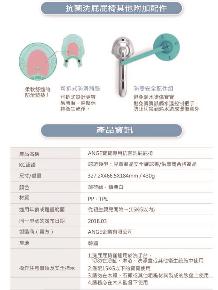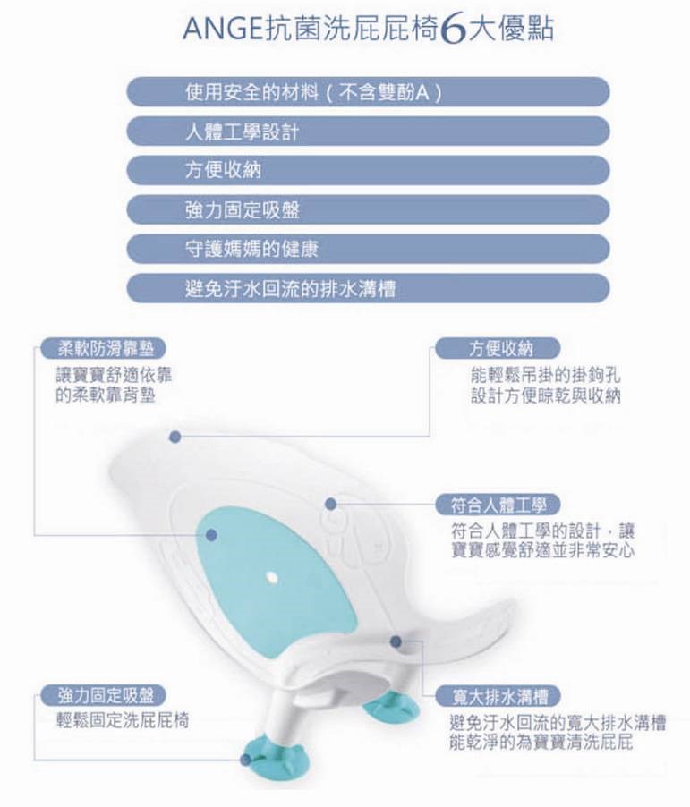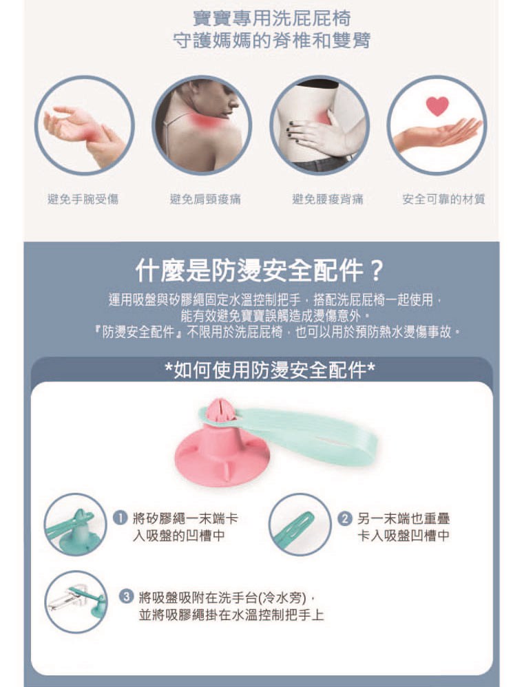 產品說明:洗屁屁椅可以在洗臉盆裡支撐寶寶重量,讓您安全、方便的幫小寶寶清洗屁屁,能有效的減少寶寶紅屁屁及泌尿道感染的情況,也讓媽媽更輕鬆省力的幫寶寶清洗,本產品使用99%以上的抗菌能力材料,能有效抑 制細 菌滋生,更加確保安全衛生。使用附加的固定熱水扣件(如圖解),可避免熱水意外流出。