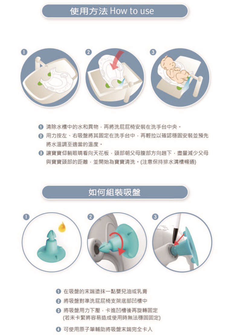 注意:沖洗寶寶屁股前,務必確保水溫在適當的舒適溫度以避免寶寶燙傷或著涼。使用前請務必確保本產品已穩固在洗臉盆上的適當位置,以確保安全。