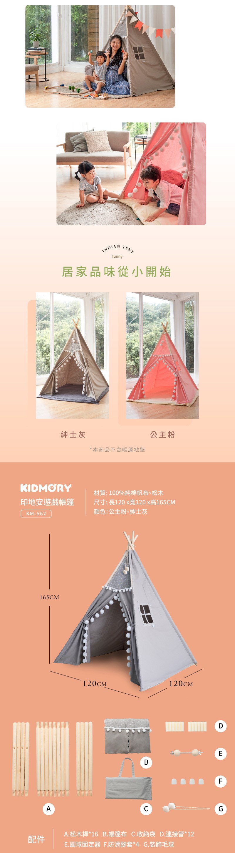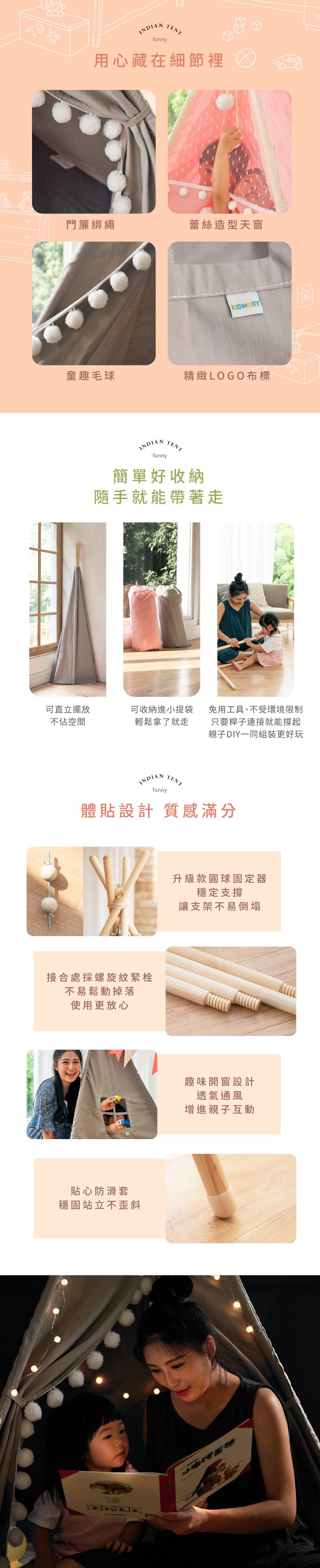 內容物:松木桿、帳篷布、收納袋、連接管、圓球固定器、防滑腳套、裝飾毛球