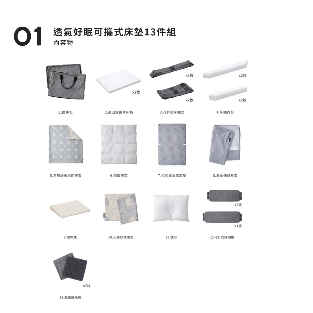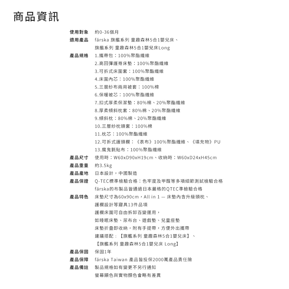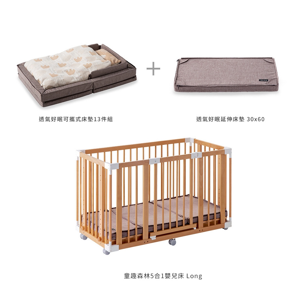 包裝內容物:【farska】童趣森林5合1嬰兒大床 Long+透氣好眠可攜式床墊13件組+透氣好眠延伸床墊 30x60