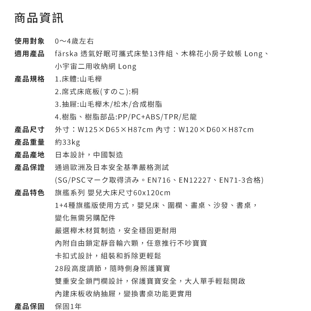 產品尺寸:嬰兒床-外寸:W125×D65×H87cm、內寸:W120×D60×H87cm