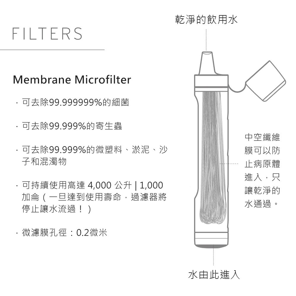 - 持久耐用的微濾膜可過濾多達 4,000 升(1,000 加侖)的水,足夠一個人飲用5年以上