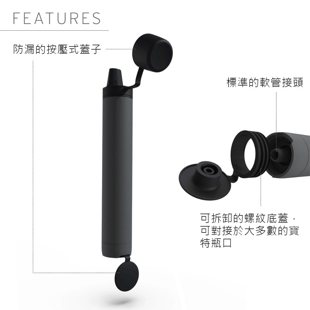 - 高度通用 - 內建標準軟管和通用的螺紋,適用於軟式水袋及大多數的寶特瓶