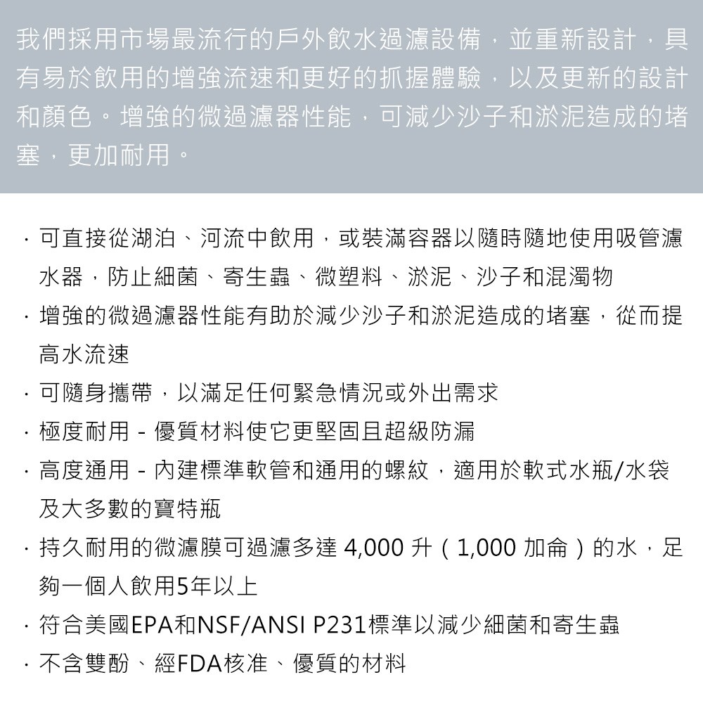 - 可直接從湖泊、河流中飲用,或裝滿容器以隨時隨地使用吸管濾水器,防止細菌、寄生蟲、微塑料、淤泥、沙子和混濁物