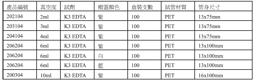以三鉀/二鉀乙二胺四乙酸做為抗凝劑,不影響白血球計數及大小,對紅血球的型態影響小,並具抑制血小板聚集的特點,與血液中的鈣離子結合成螯合物,從而阻止血液凝固。