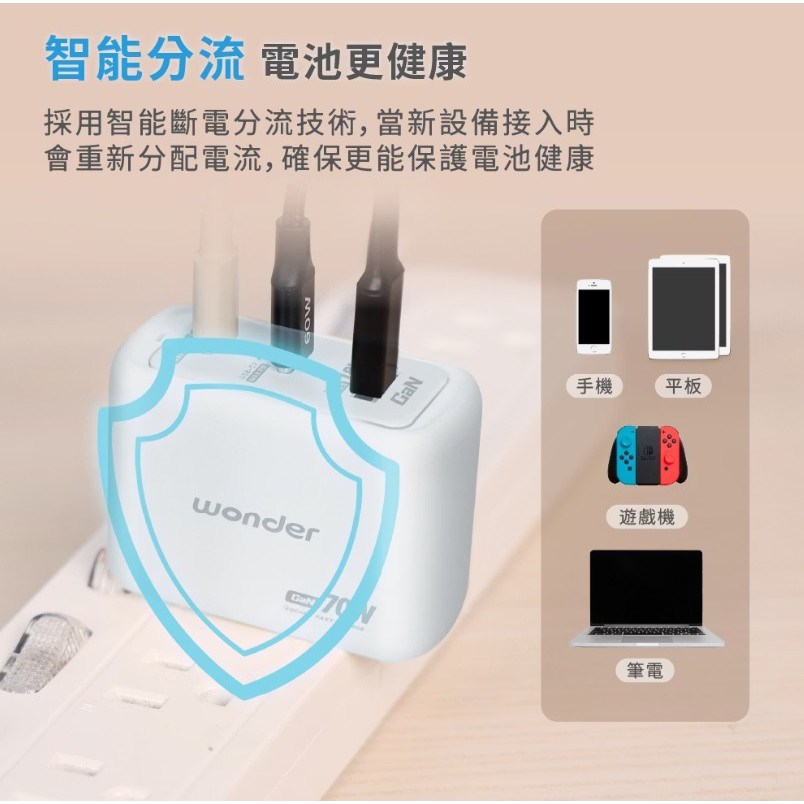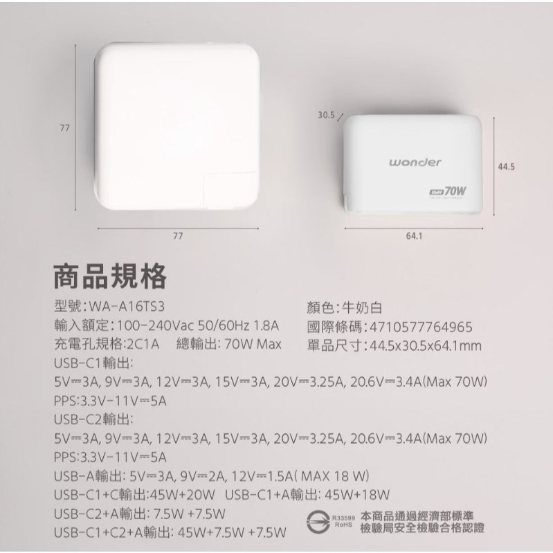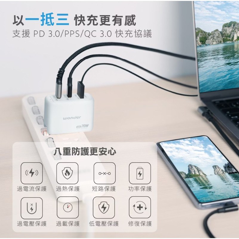 USB-C2輸出: 5V⎓3A, 9V⎓3A, 12V⎓3A, 15V⎓3A, 20V⎓3.25A, 20.6V⎓3.4A(Max 70W) PPS:3.3V-11V⎓5A