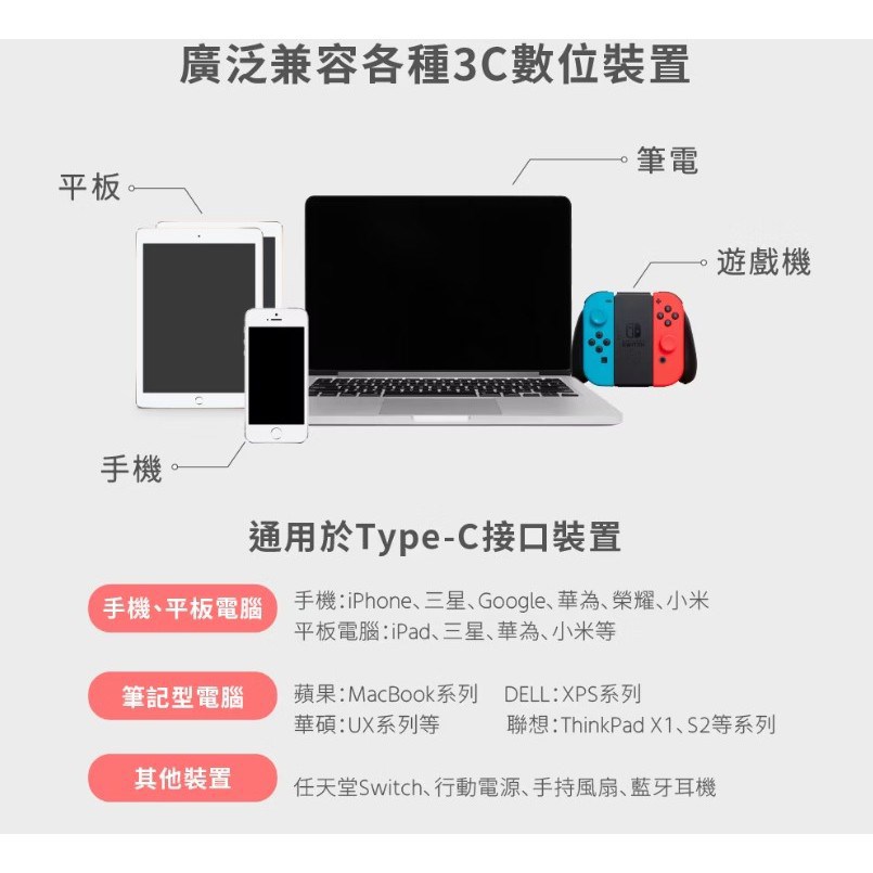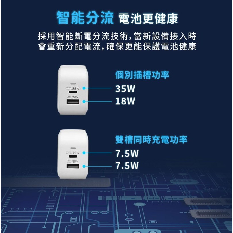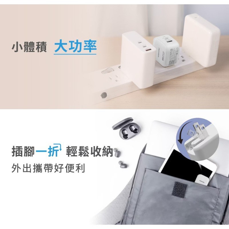 USB-C輸出: 5V⎓3A, 9V⎓3A, 12V⎓2.5A, 15V⎓2.33A, 20V⎓1.75A (Max 35W) PPS: 5-11V⎓3A