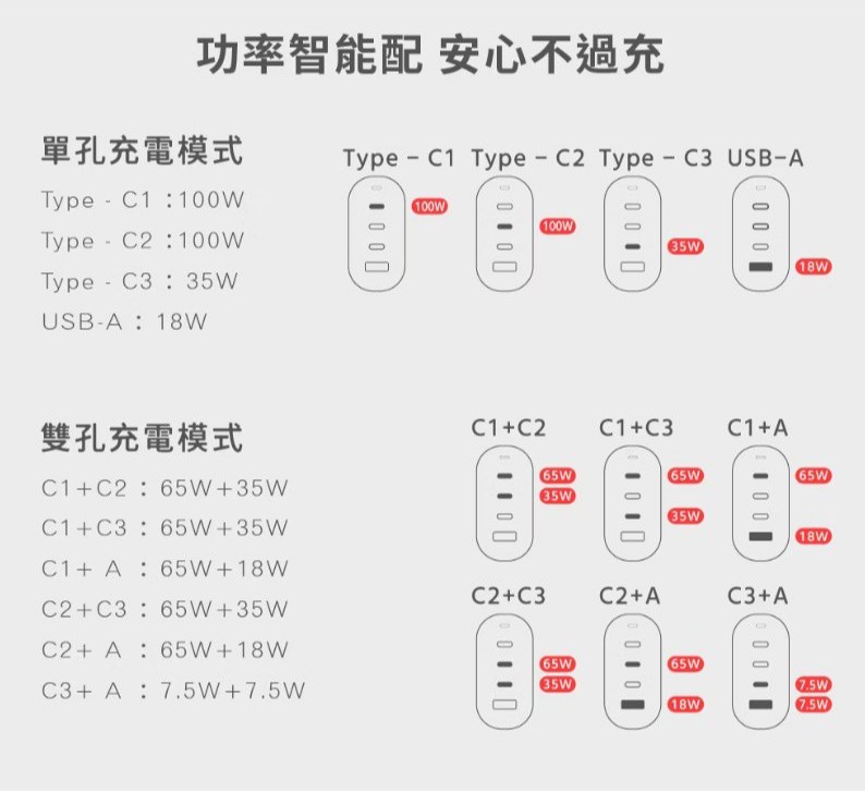 USB-C1+C2/C1+C3/C2+C3輸出: 65W+35W