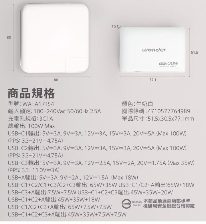 USB-C1/C2+C3+A輸出: 65W+7.5W+7.5W