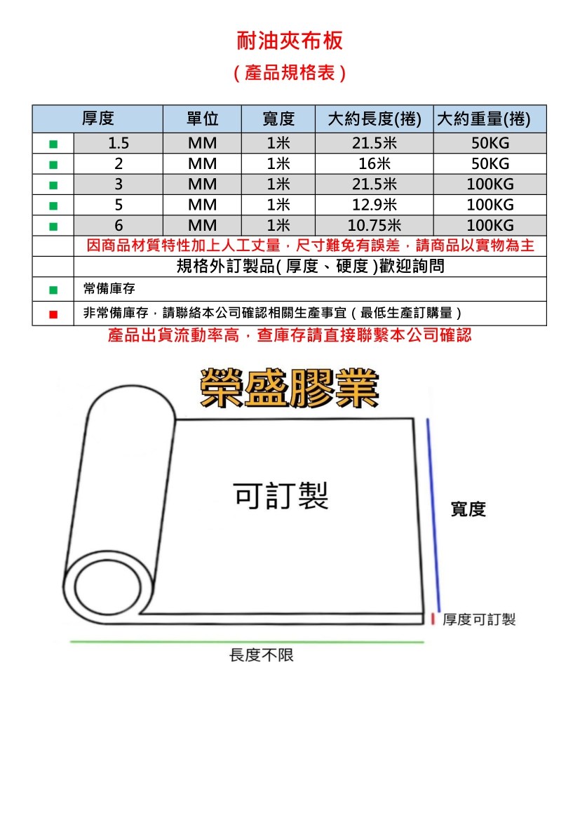 耐油夾布板尺寸為寬度100公分(1米),長度不拘,可接受客製化製作,如有其他材質想詢問歡迎來電洽詢,我們提供最專業的服務