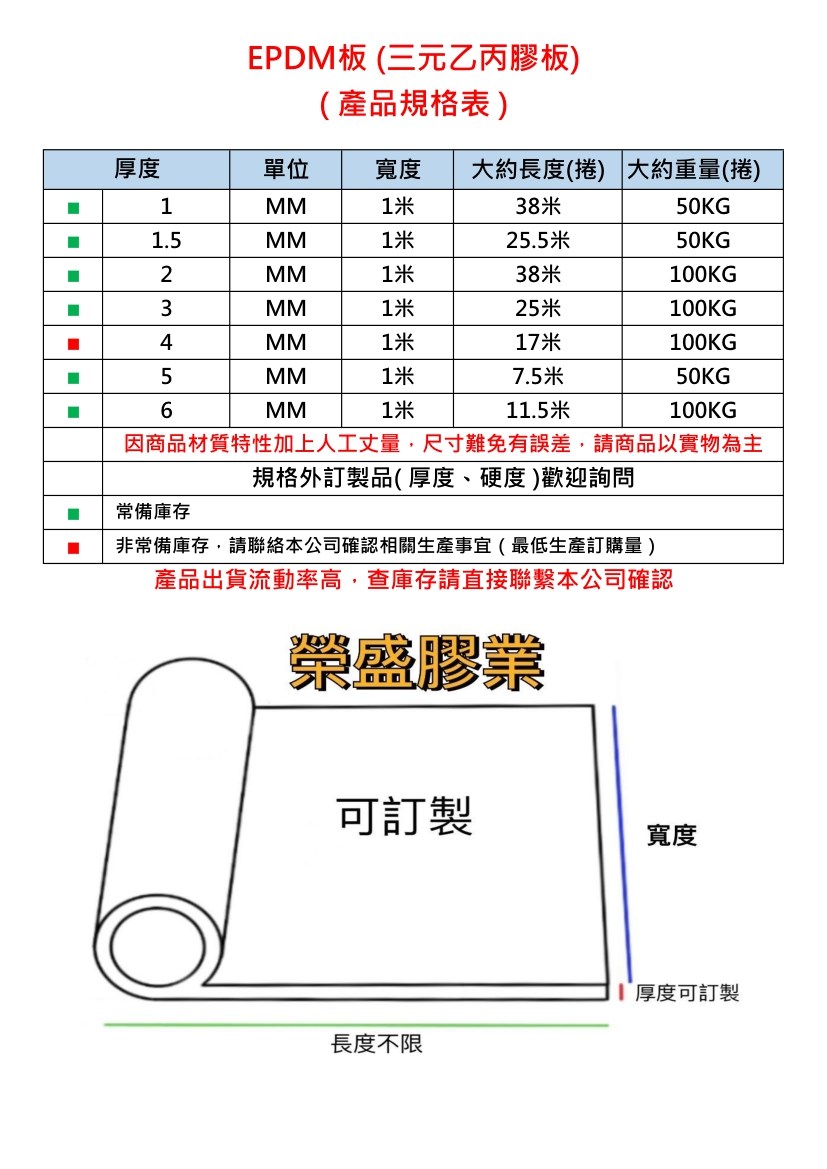 EPDM(三元乙丙)橡膠板尺寸為寬度100公分(1米),可接受客製化製作,如有其他材質及厚度歡迎來電洽詢,我們提供最專業的服務