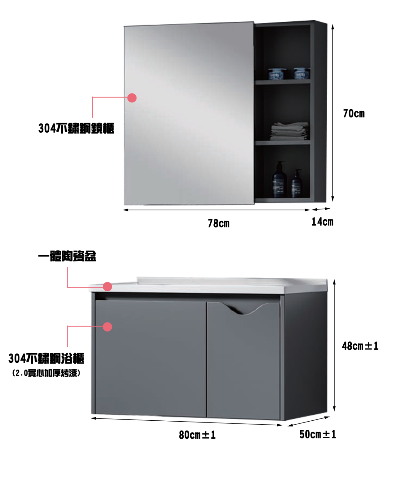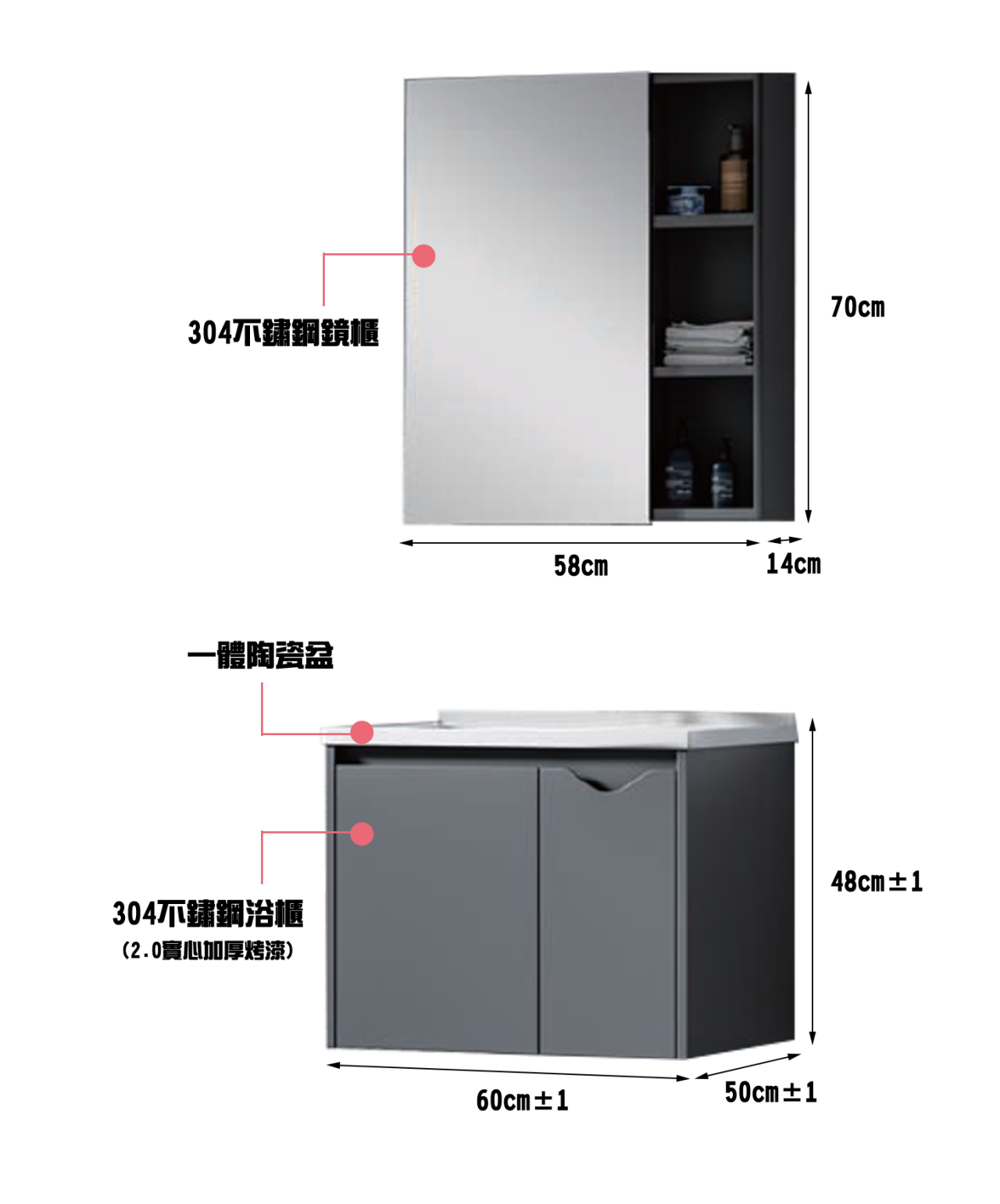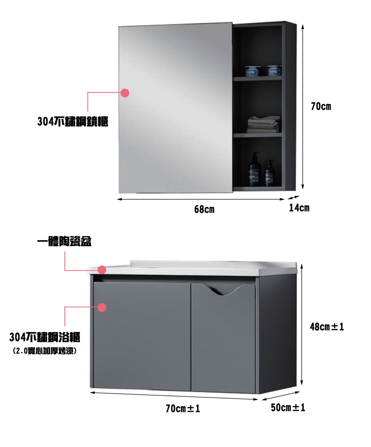 主櫃:600/700/800*500*480 鏡櫃:580/680/780*140*700