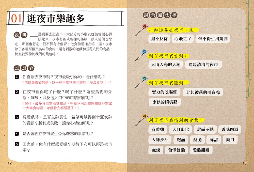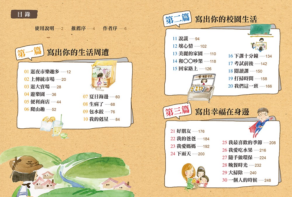 日常情境主題:全書收錄三十個貼近孩子生活的主題,讓孩子觀察生活周遭、產生共鳴,進而寫出生動文章。