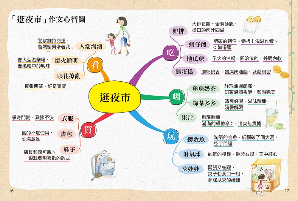主題心智圖:從主題中心聯想各種相關情景、情緒、人事物,強化思考,培養想像力及創造力。