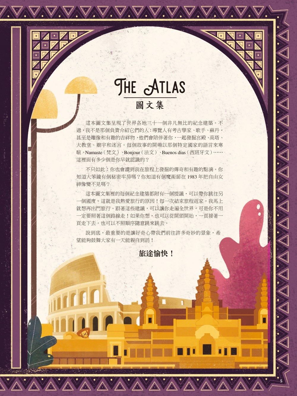 這本書中每個紀念建築的最後都會提供讀者一個提議,用建築物的連結帶你跳往另一個國度。跟著這些建議,可以讓你行遍全世界。您也可以從開頭開始,一頁接著一頁走下去。