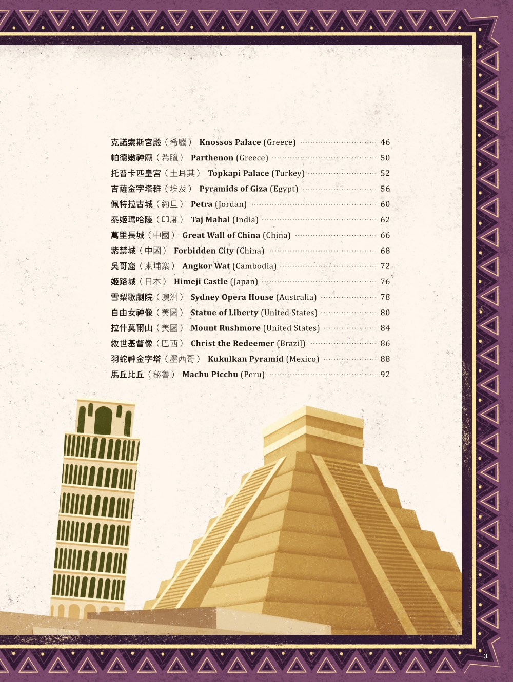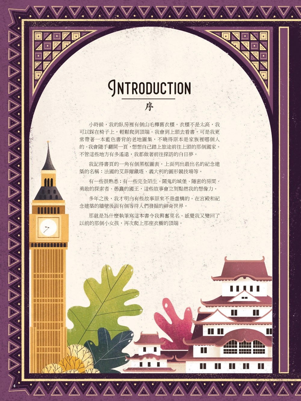 本書可當作親子最佳床邊故事集,分別介紹世界知名度最高的31座建築物,建築物名稱提供中英文對照,細訴每一座建築物的基本資料、別名、高度、地點等資訊。不僅用各國語言的問候與做為開頭,並透過與該建築物相關的人物,由他來介紹建築物背後的故事,和建築物與眾不同之處,每篇介紹的最後搭配了探索類似場景的連結,連貫各建築物的特性。