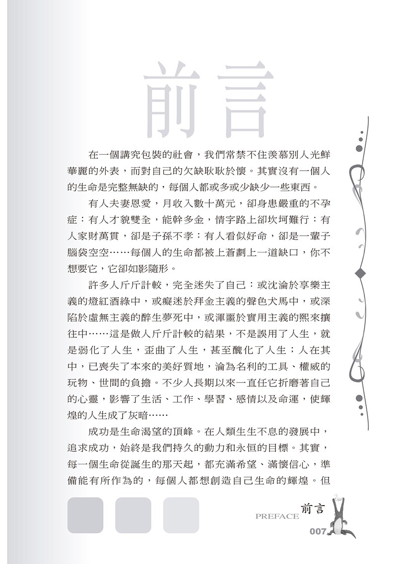 在一個講究包裝的社會,我們常禁不住羡慕別人光鮮華麗的外表,而對自己的欠缺耿耿於懷。其實沒有一個人的生命是完整無缺的,每個人都或多或少缺少一些東西。