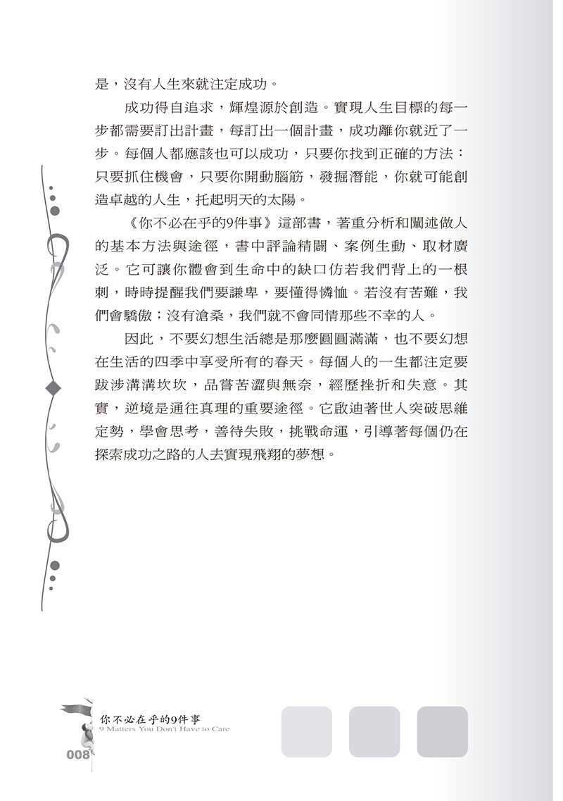 成功得自追求,輝煌源於創造。實現人生目標的每一步都需要訂出計畫,每訂出一個計畫,成功離你就近了一步。每個人都應該也可以成功,只要你找到正確的方法:只要抓住機會,只要你開動腦筋,發掘潛能,你就可能創造卓越的人生,托起明天的太陽。