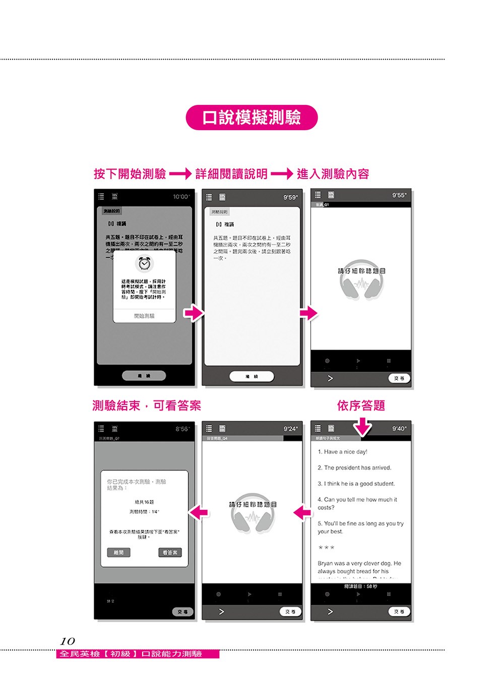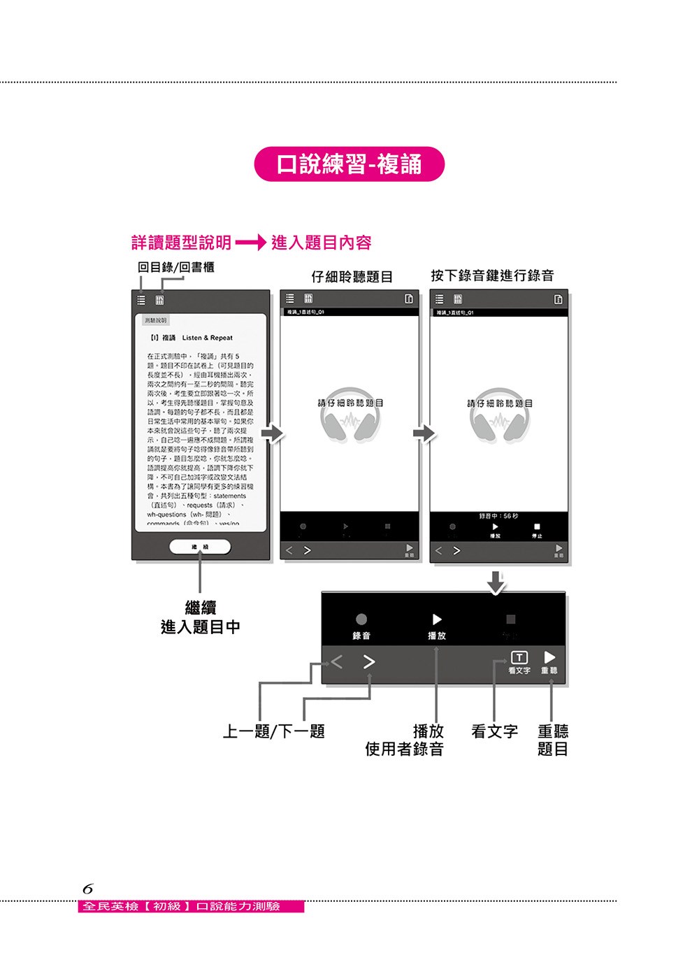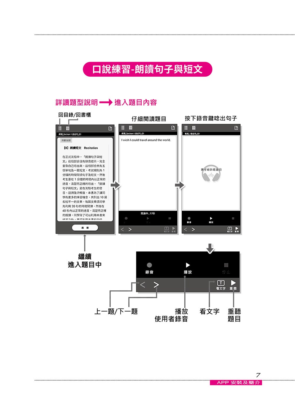4. 每句話均由專業配音員錄製,試題份量充足,可於正式測驗前有效提升練習量,打磨答題時的即時反應,擴增語彙能力。