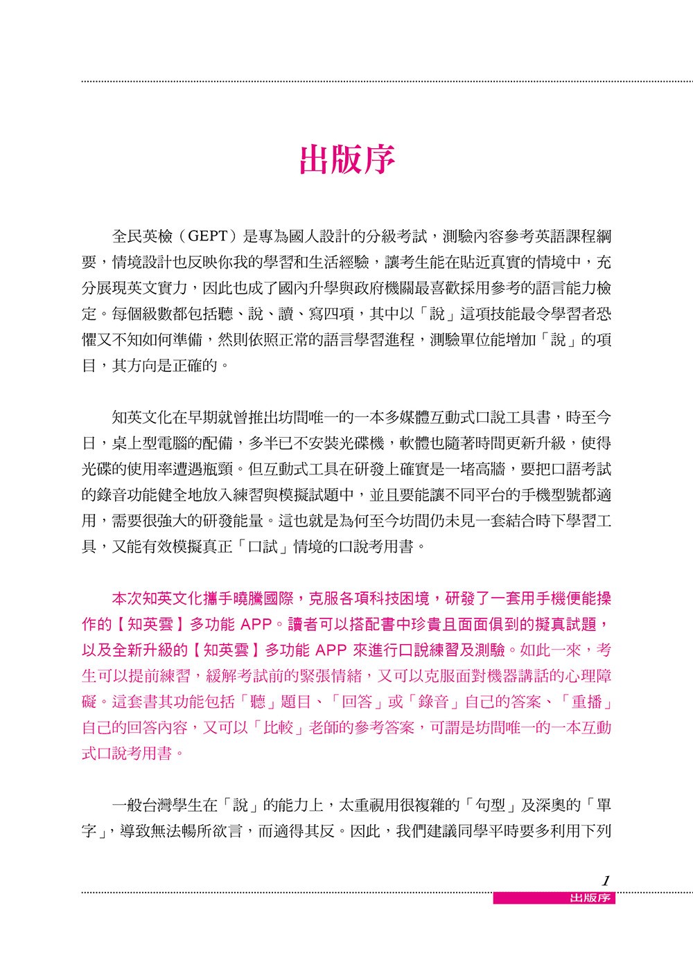 ★ 隨書加贈《知英雲APP》,可從手機下載,Mebook書櫃提供了全民英檢口說測驗模式,輸入紙本書中的搭配序號後,可取得完整的口說測驗,進行口說的練習與模擬測驗。