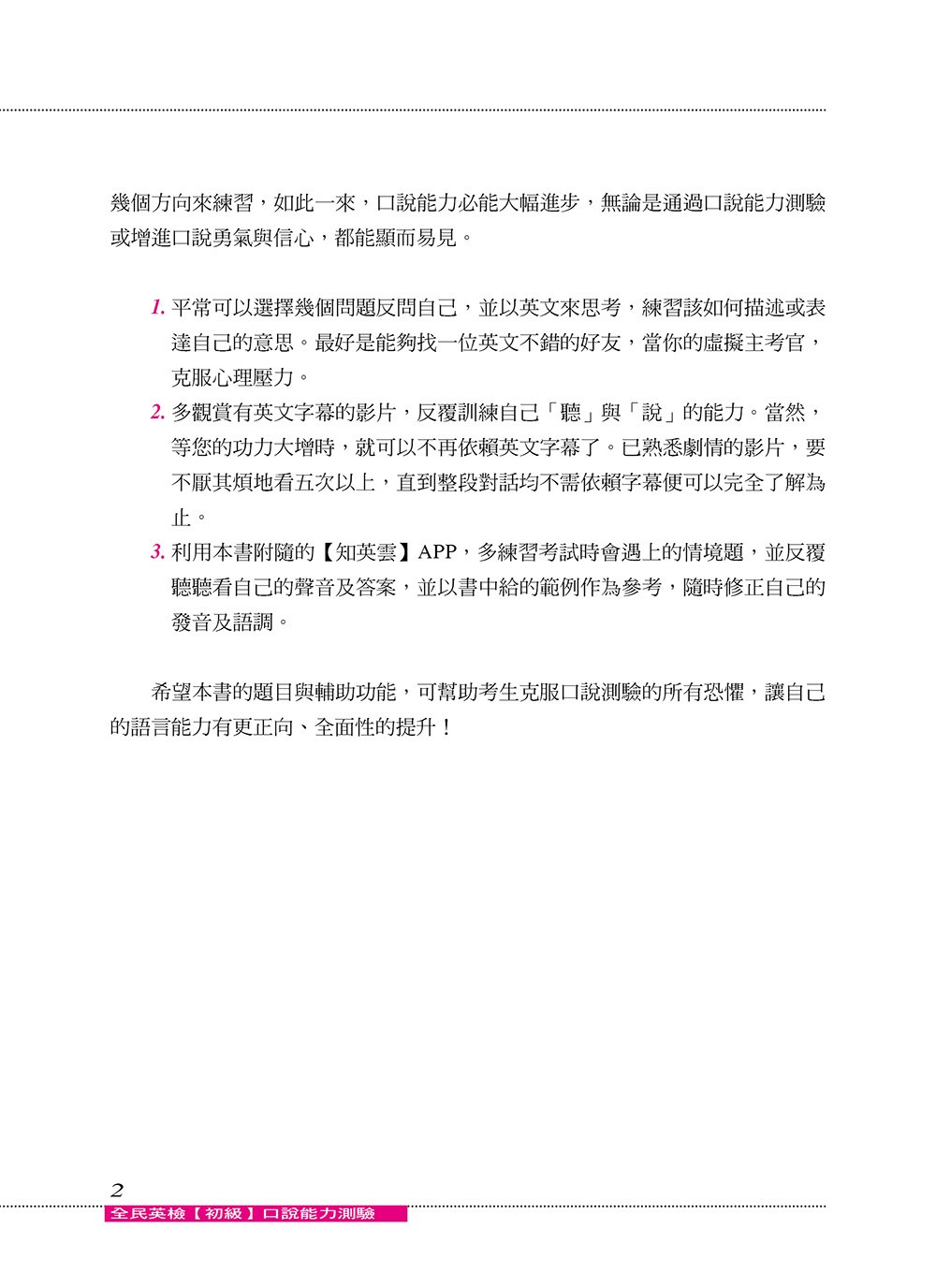 1. 首創以互動式APP打造全真模擬練習環境的英檢初級口說測驗自學考用書。