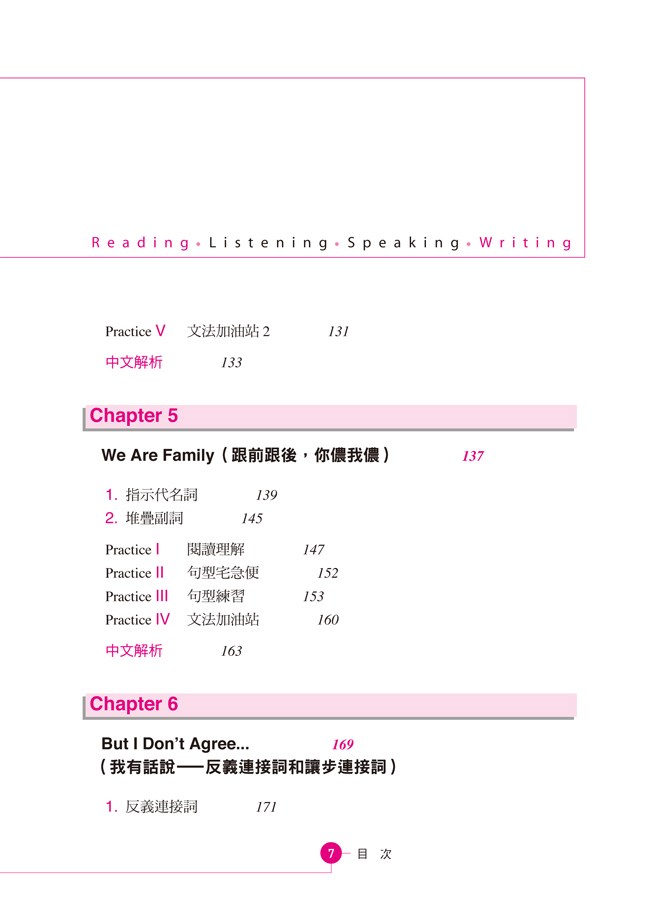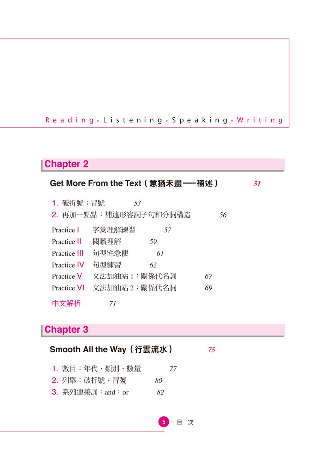 溫習組織文章的機制,例如「邏輯推理」、「對照」和「平行對等」,捷進讀者的閱讀技巧,閱讀時得以享受行雲流水般的順暢。