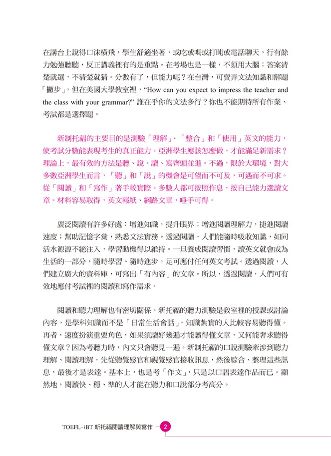 由淺入深,循著「單字→單句→段落→文章閱讀→寫作」的順序,有系統地為讀者打好基礎,建立新托福整合式寫作實力。