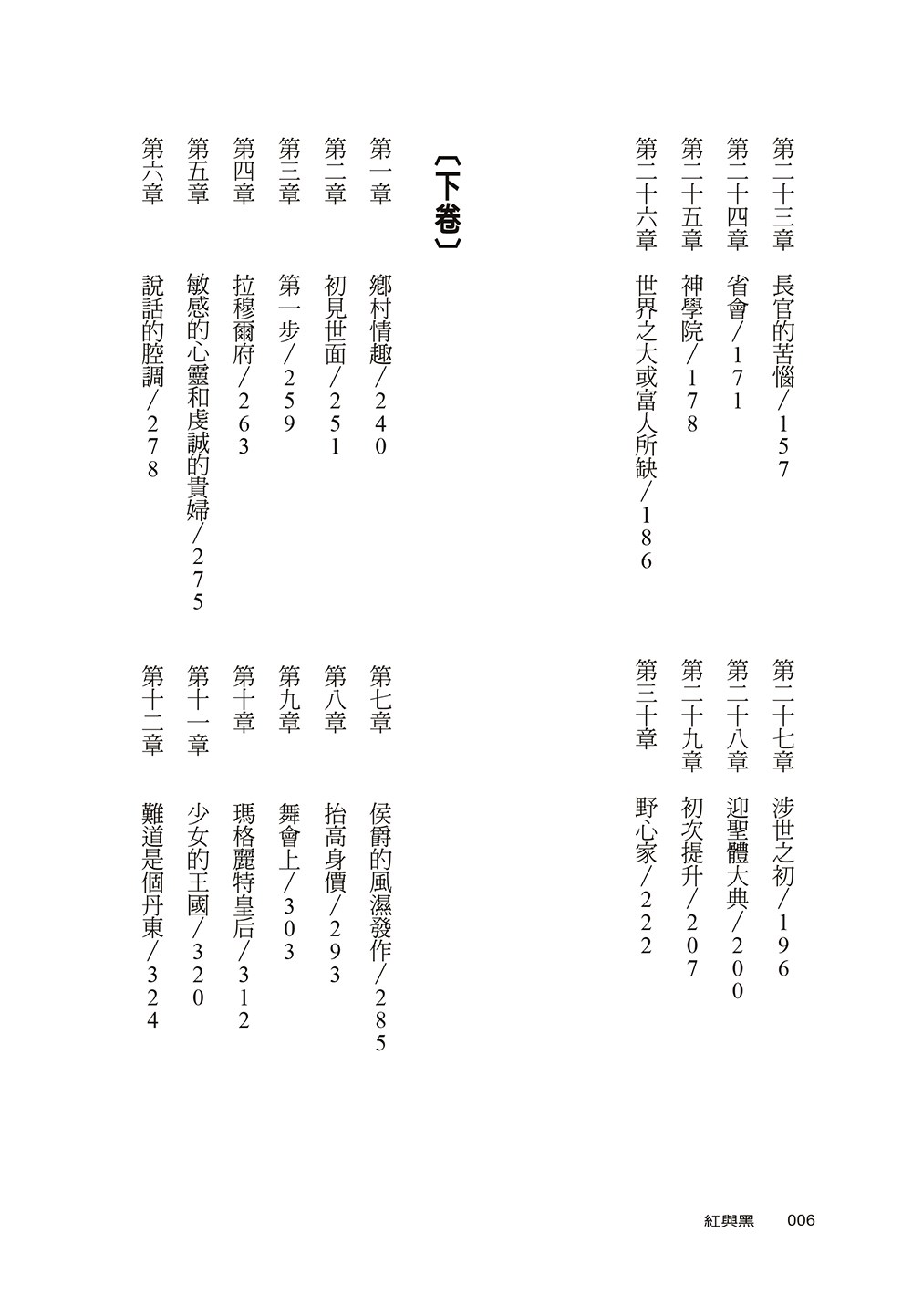 于連是木匠的兒子,精明能幹富有野心,由於精通拉丁文,被選作市長家的家庭教師,市長年輕漂亮的妻子雷納夫人是在修道院長大的,對像她丈夫那樣庸俗粗魯的男人感到厭惡,於是當她見到年輕英俊且溫柔動人的于連時,漸漸對他產生了好感,于連也瘋狂地追求雷納夫人,兩個人暗通款曲,然而紙包不住火,兩人的事跡敗露,于連逃離市長家,進了神學院,經神學院院長推薦,于連到巴黎擔任拉穆爾侯爵的私人秘書,很快就得到侯爵的賞識和重用,此時于連又與侯爵的女兒瑪蒂爾德有了私情,瑪蒂爾德意外懷孕,侯爵震怒之餘做出妥協,答應了于連和女兒的婚事,然而此時卻收到了雷納夫人在教會逼迫下寫的一封告密信,使于連的飛黃騰達毀於一旦,在氣憤之下開槍擊傷深愛他的雷納夫人,也因此被送上斷頭臺,而于連竟然拒絕上訴……