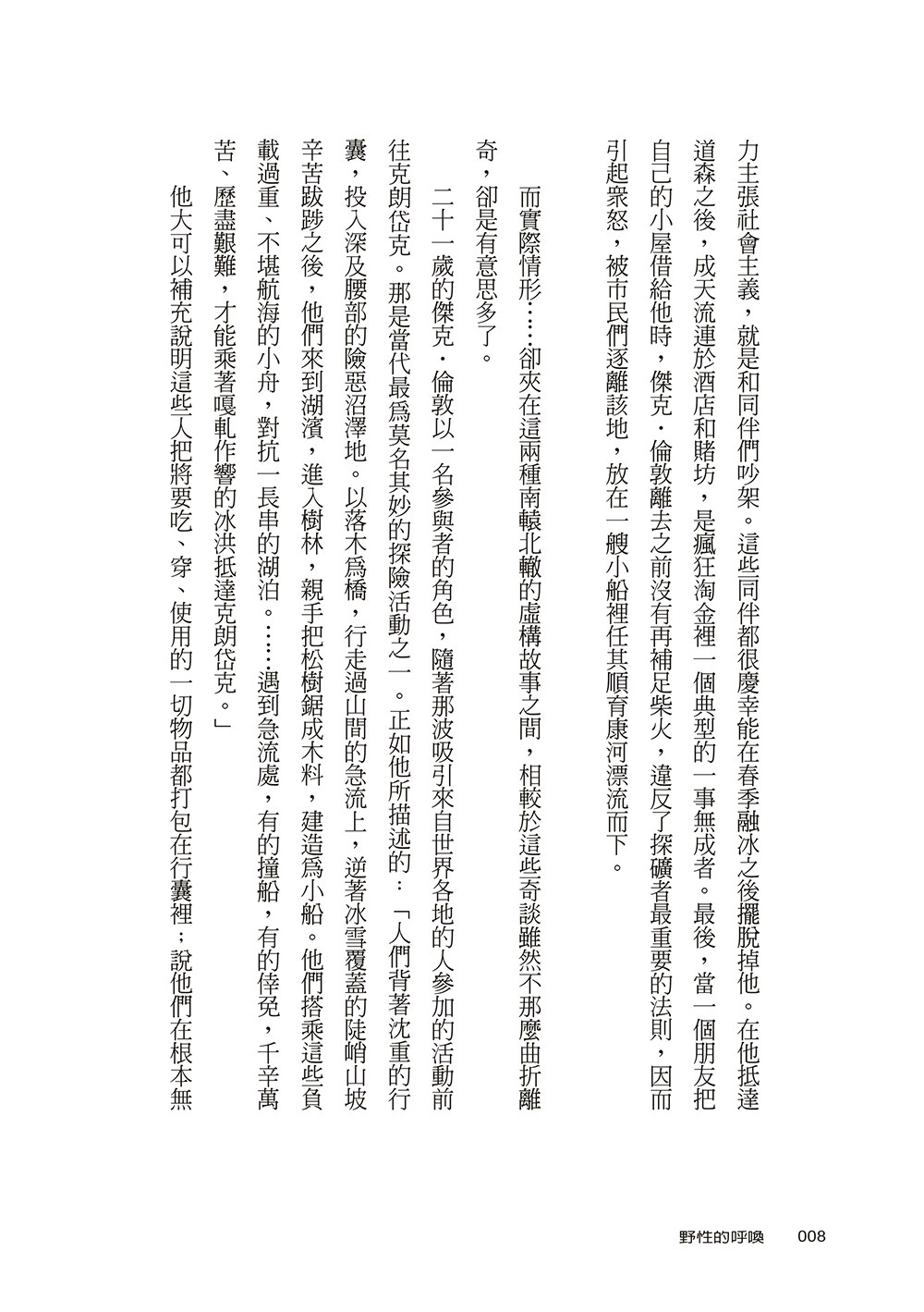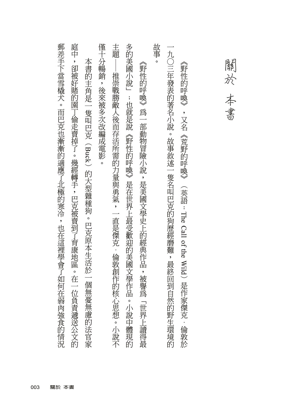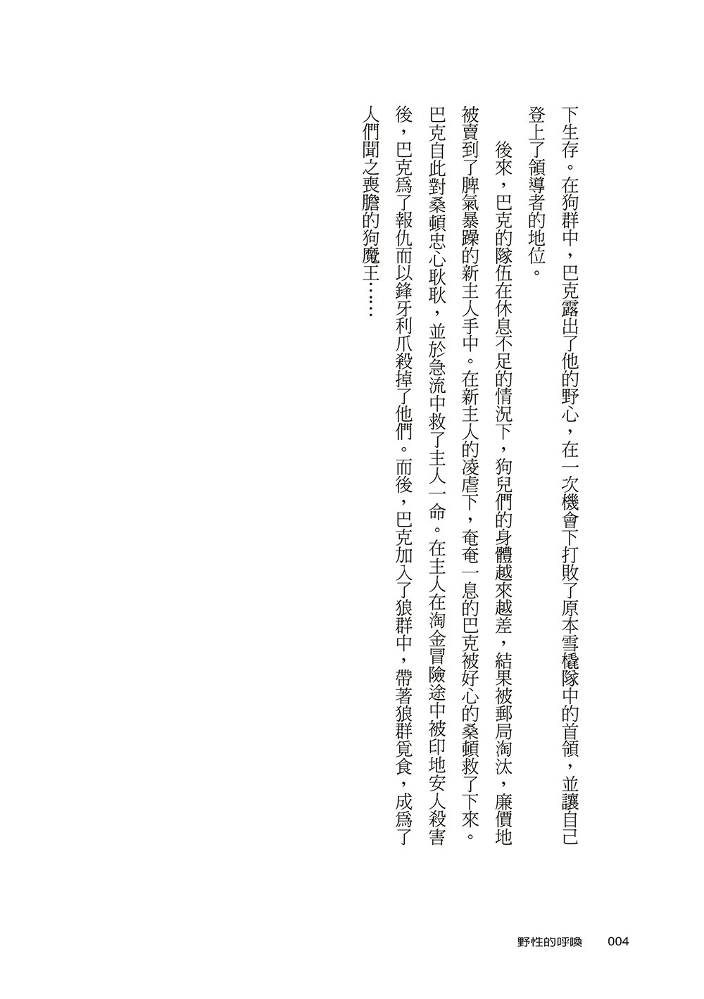 故事敘述一隻名叫巴克的狗歷經磨難,最終回到自然野生環境的故事。