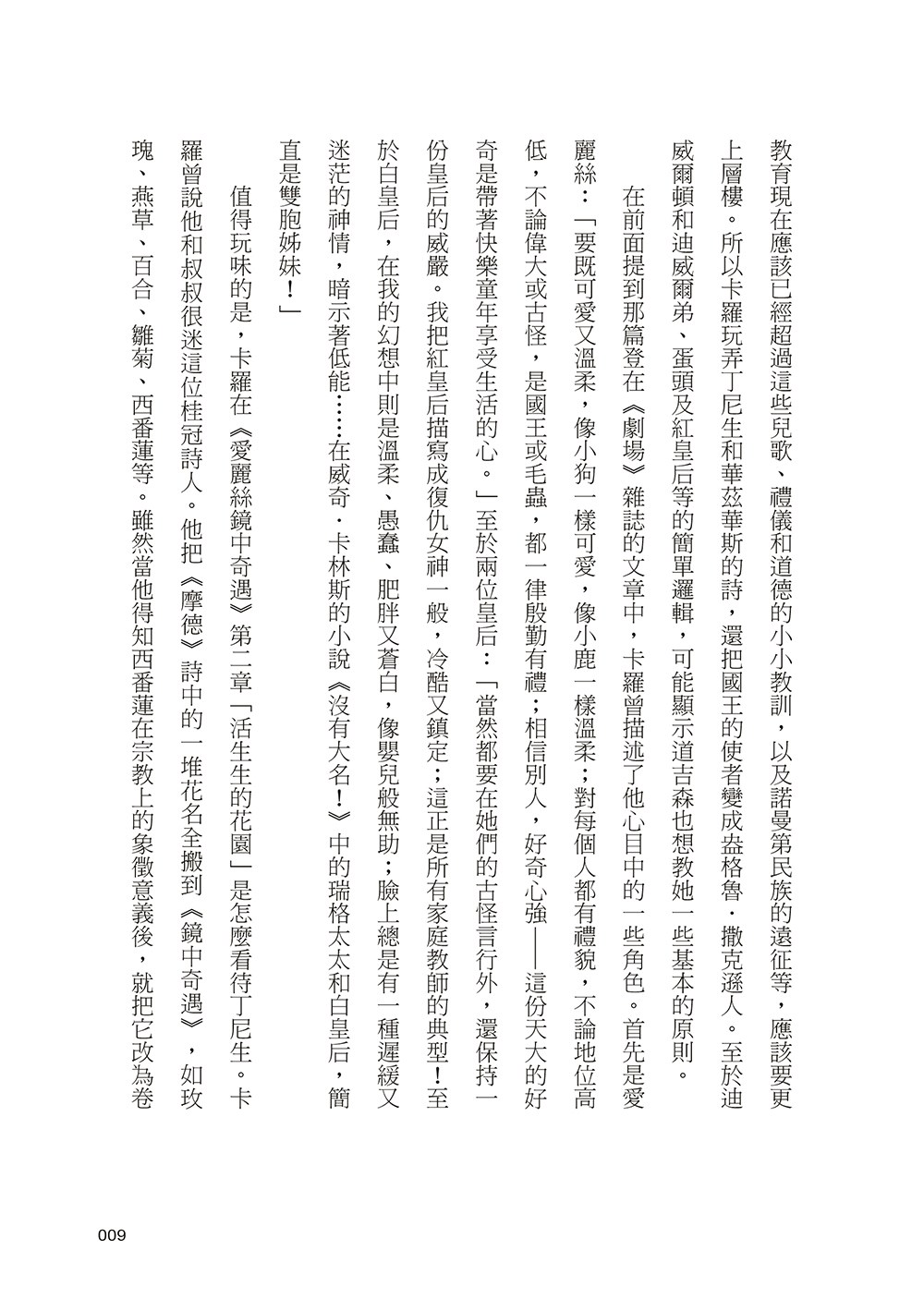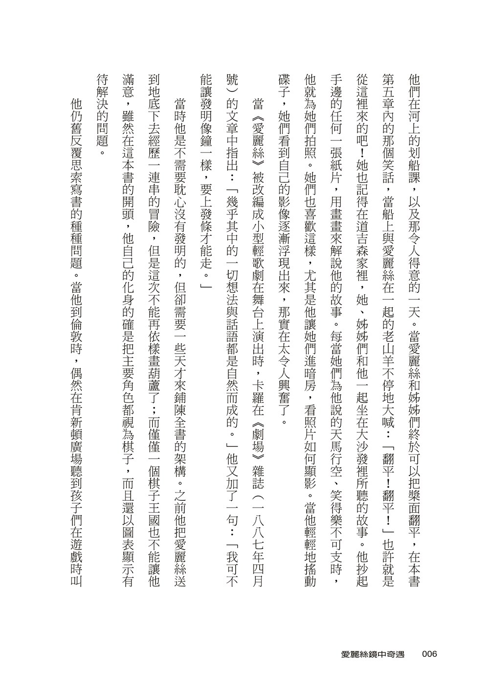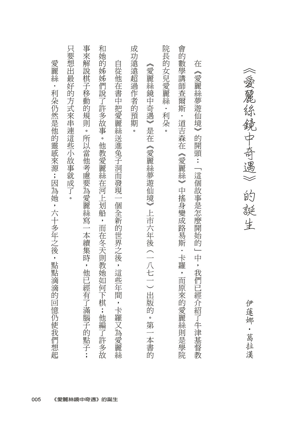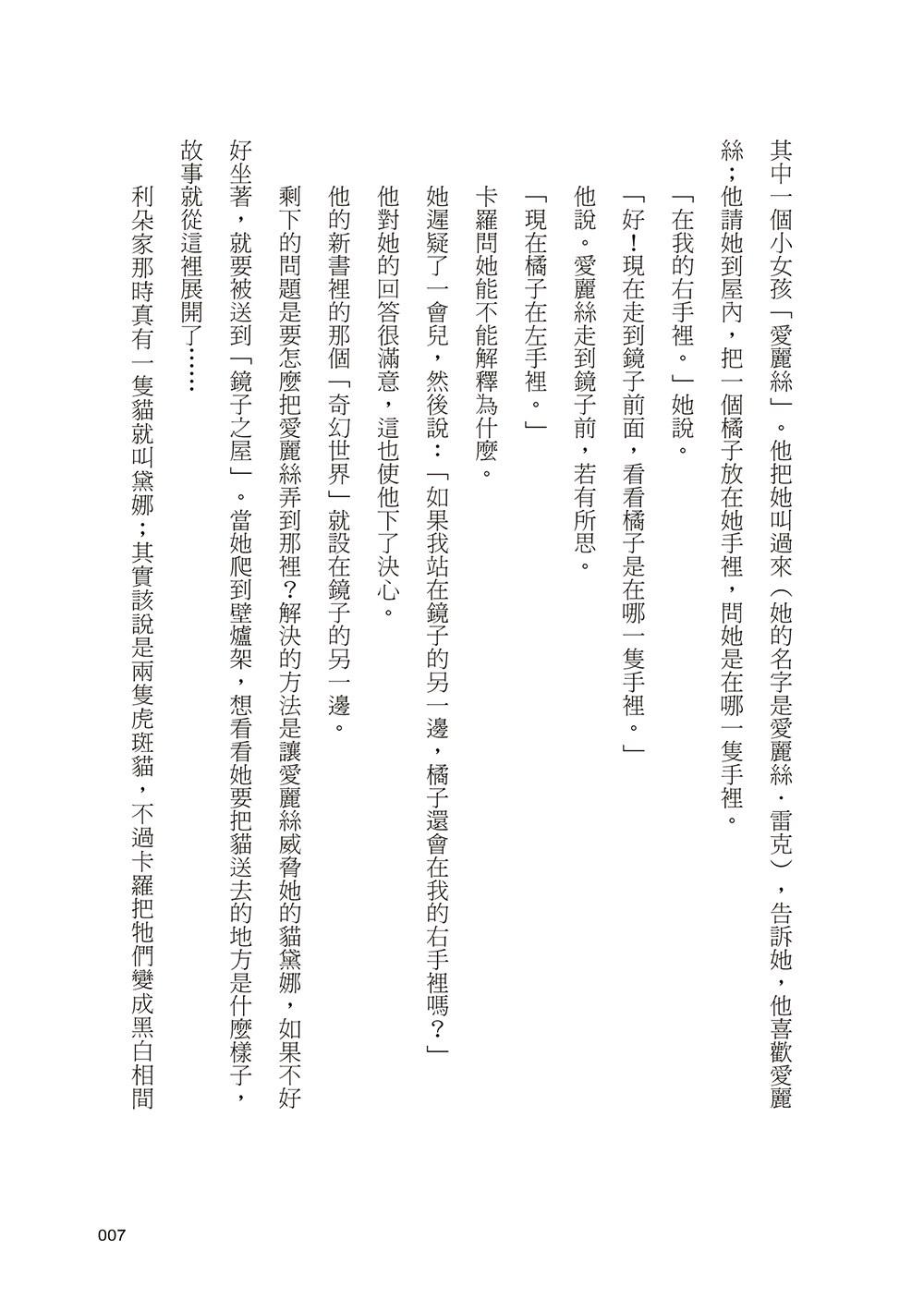 愛麗絲穿透了鏡子,跑到鏡子裡,展開新的奇幻旅程,鏡子裡的世界是一個大棋盤,她一格一格往前走,遇見了西洋棋子、會說話的花、有趣的叮噹兄弟,雜貨店的綿羊老闆、牆上的蛋頭先生、傳說中的獨角獸等等,走到第八格時,變成了皇后,舉辦了一場不可思議又超乎想像的宴會……