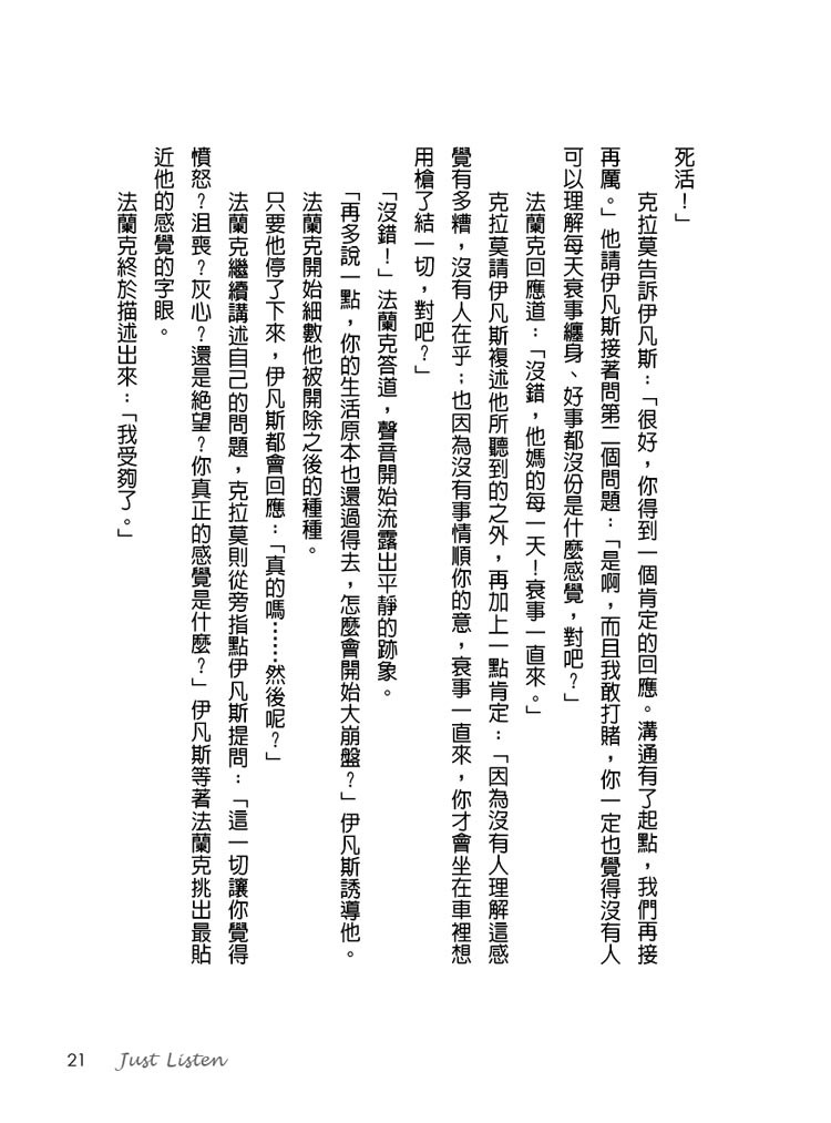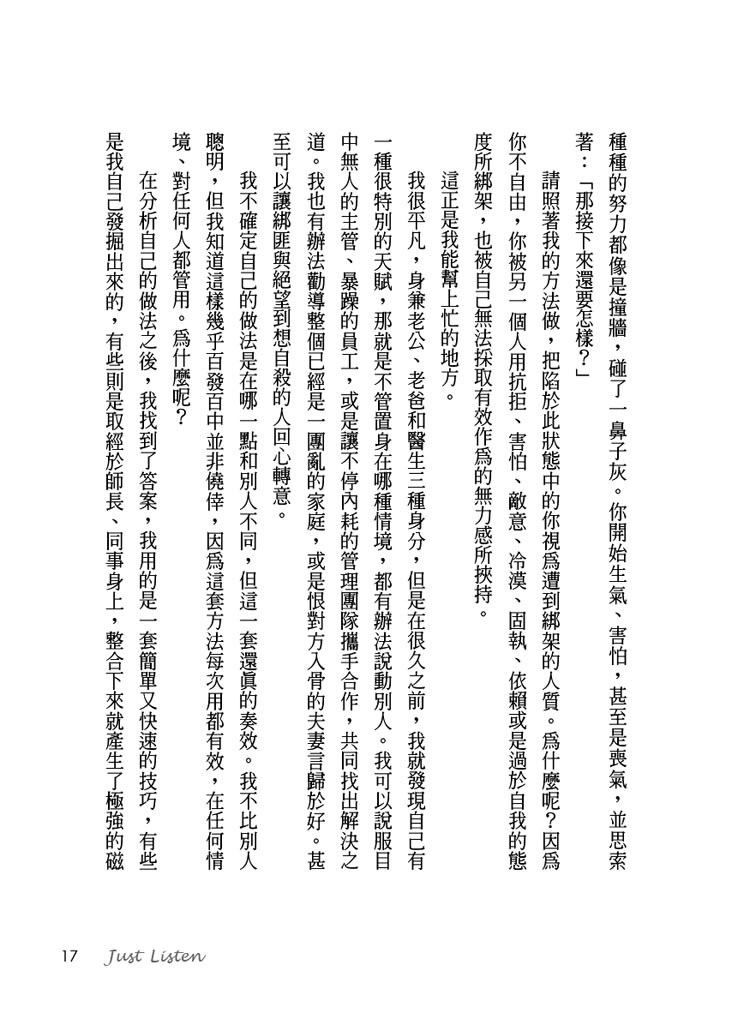 一邊看《先傾聽就能說服任何人》這本書,我的大腦也一邊忙碌地回顧:碰到同樣的狀況,自己會如何處理應對?幸運的是,我的工作跟本書的作者馬克.葛斯登有很多異曲同工之處,包括專業心理諮商、為企業提供員工心理諮商與輔導協助、寫書以及演講。我發現,作者不僅將心理諮商技巧融會貫通,而且將精華提煉得簡單好消化,即使沒有心理學相關背景的人也能夠透過有效的提問,輕鬆引導別人從抗拒到傾聽、從考慮到願意、從願意到行動,這套「行為改變技術」適合所有需要與人溝通的主管、上班族、父母、夫妻,還有渴望「改變關係」的人,相信都能從這本書中得到意想不到的收穫。 --林萃芬(專業諮商心理師)