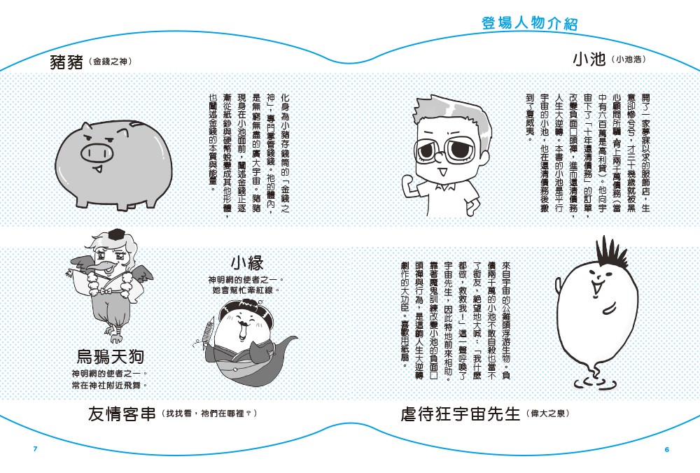 這次負責指導當年背債小池的,除了用詞犀利惹人愛的虐待狂「宇宙先生」,還有首次亮相的金錢之神「存錢筒豬豬」,三人聯手透過15個爆笑的「錢錢劇場」反轉人人常有的錯誤金錢觀,讓讀者在歡笑中秒懂讓錢錢開心才會繼續來找你的「運財之道」。劇場後的「錢錢開講」,徹底解鎖自己造成的缺錢詛咒、還有如何建立讓財運變好的富習慣,更重要的是,在金錢和生活之間找到平衡,還能讓錢錢笑開懷,快速吸引更多錢錢來找你的致富心法。