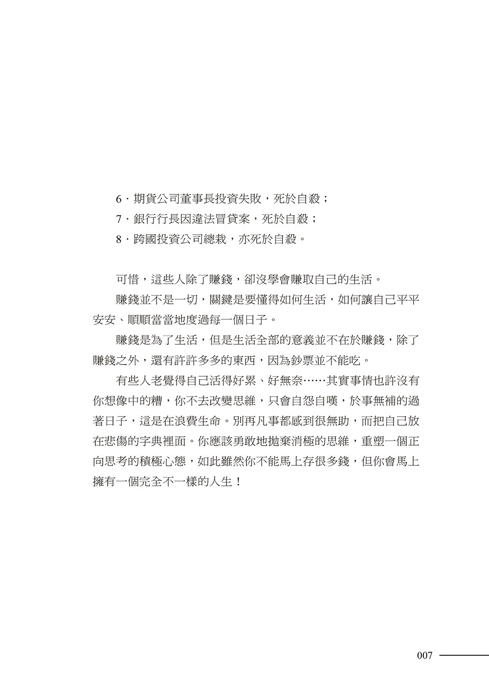 有些人老覺得自己活得好累、好無奈……其實事情也許沒有你想像中的糟,你不去改變思維,只會自怨自嘆,於事無補的過著日子,這是在浪費生命。別再凡事都感到很無助,而把自己放在悲傷的字典裡面。你應該勇敢地拋棄消極的思維,重塑一個正向思考的積極心態,如此雖然你不能馬上存很多錢,但你會馬上擁有一個完全不一樣的人生!