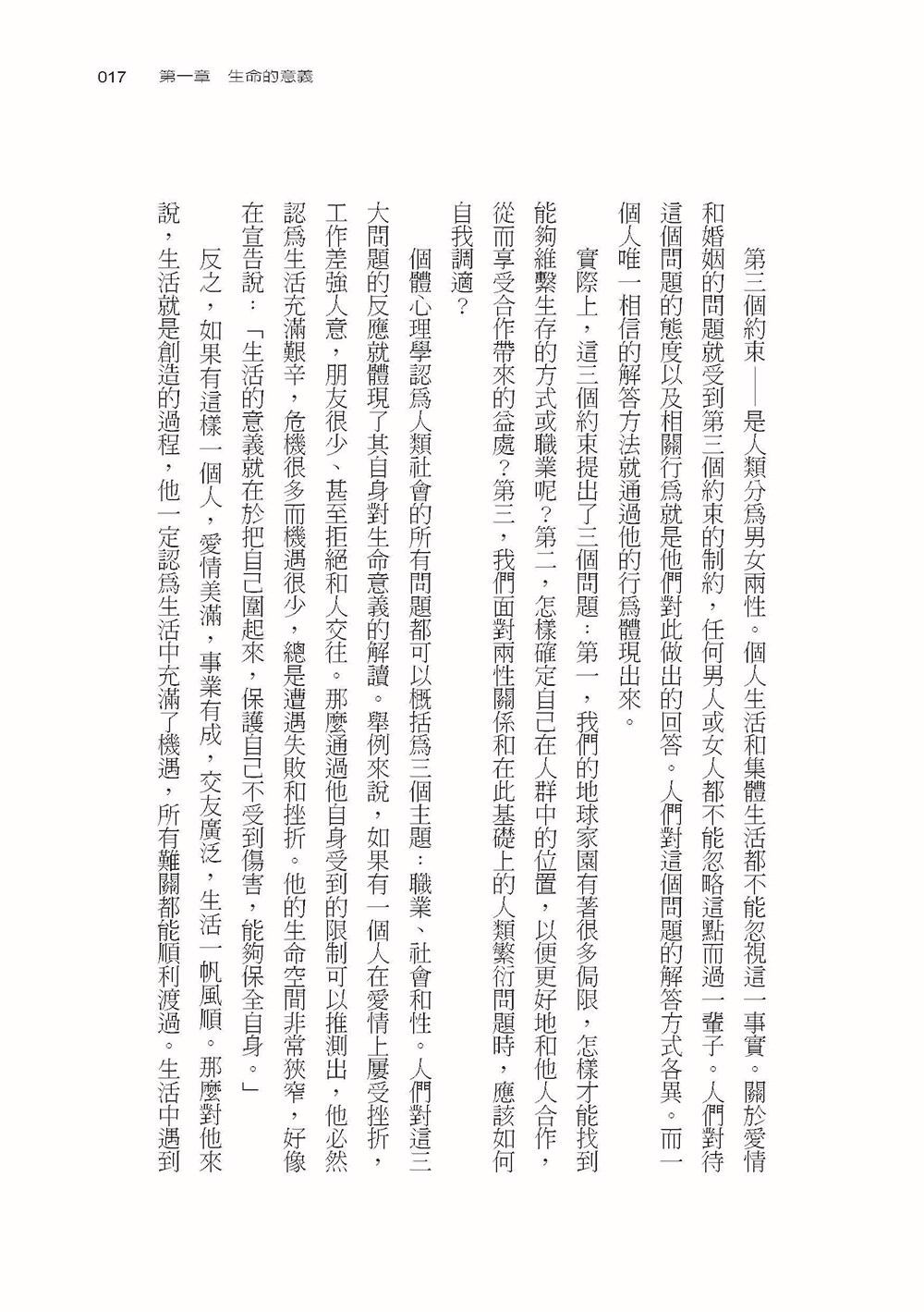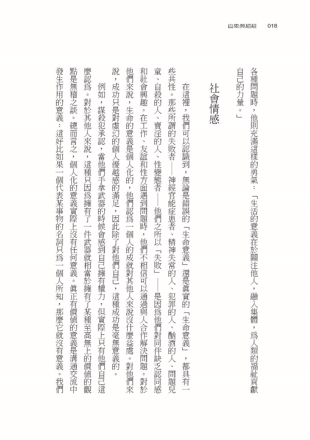 本書是個體心理學創始人阿德勒的經典著作,透過深入剖析與研究每個人與生俱來以及生命中的一系列自卑情結,提供了化自卑為動力,從而克服自卑心理,不斷超越自己,全書從教育、家庭、婚姻、倫理、社交等多個領域,以大量的實例為論述基礎,闡明了人生道路的方向和生命意義的真諦,幫助人們正確面對缺陷、對待職業、理解社會,具有極深的哲理性,無論在做什麼,都要克服自身的障礙,不斷追求卓越,時刻感受到與這個社會的連結,在有限的生命空間內發揮出最大的人生價值。