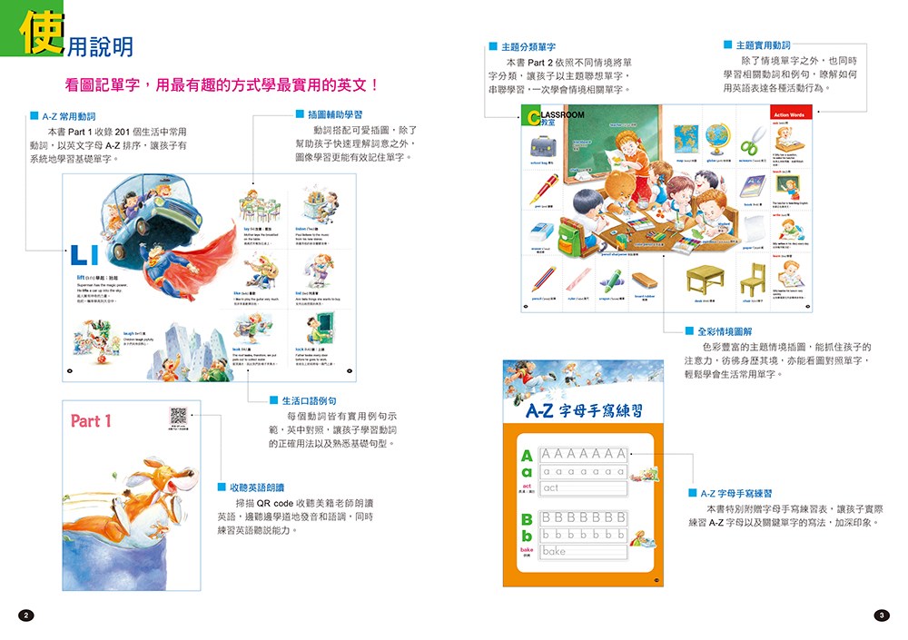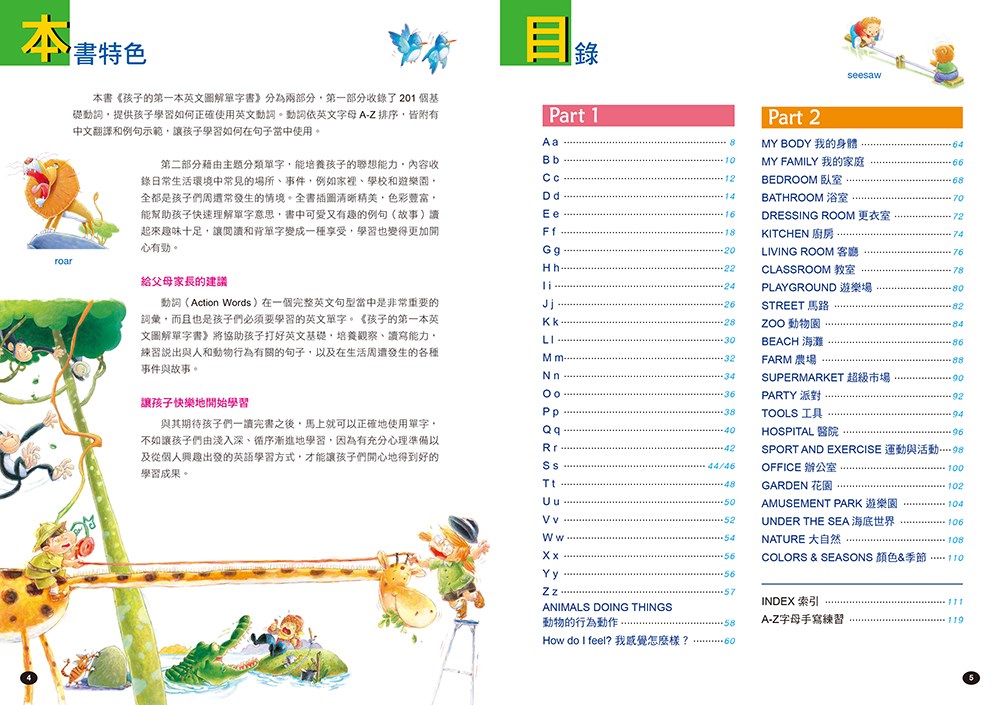 本書《孩子的第一本英文圖解單字書》分為兩部分,第一部分收錄了201個基礎動詞,提供孩子學習如何正確使用英文動詞。動詞依英文字母A-Z排序,皆附有中文翻譯和例句示範,讓孩子學習如何在句子當中使用。