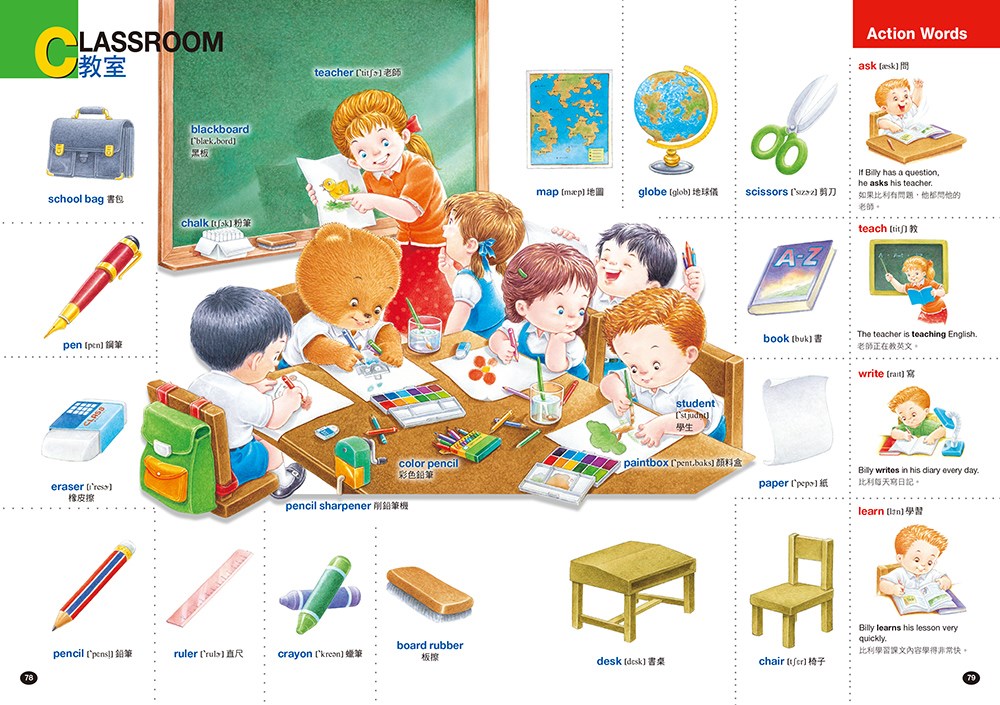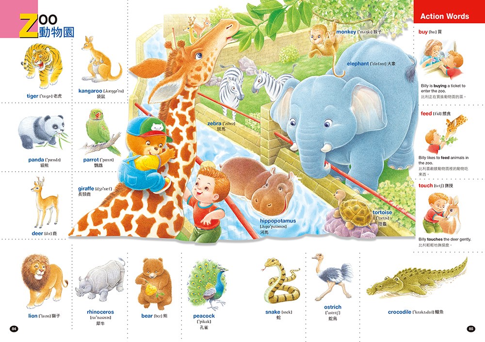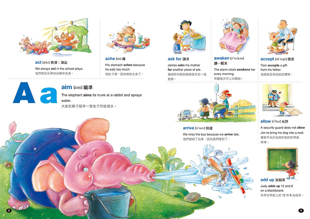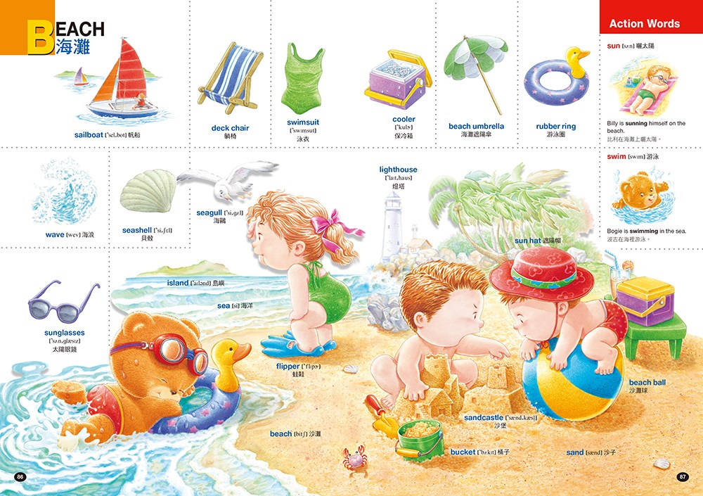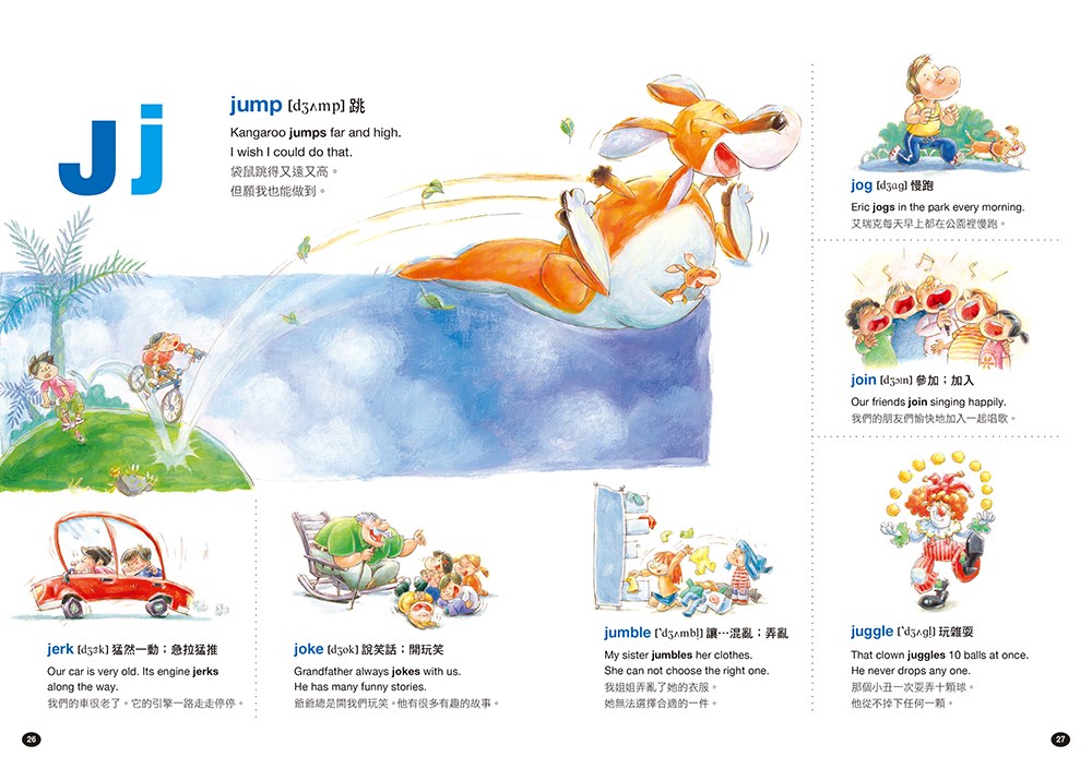 動詞(Action Words)在一個完整英文句型當中是非常重要的詞彙,而且也是孩子們必須要學習的英文單字。《孩子的第一本英文圖解單字書》將協助孩子打好英文基礎,培養觀察、讀寫能力,練習說出與人和動物行為有關的句子,以及在生活周遭發生的各種事件與故事。