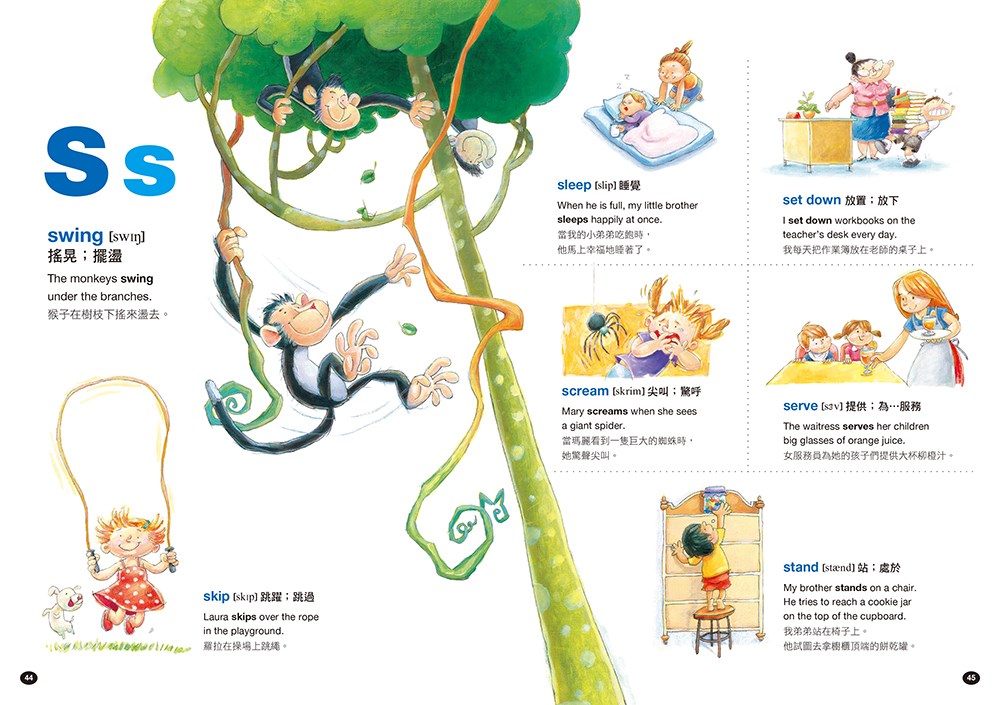 .生活口語例句:每個動詞皆有實用例句示範,英中對照,讓孩子學習動詞的正確用法以及熟悉基礎句型。