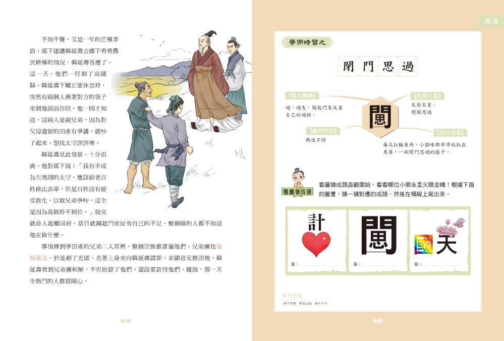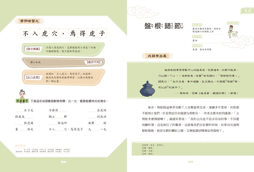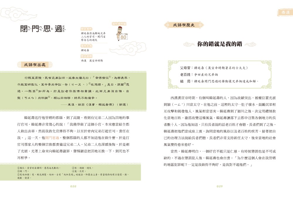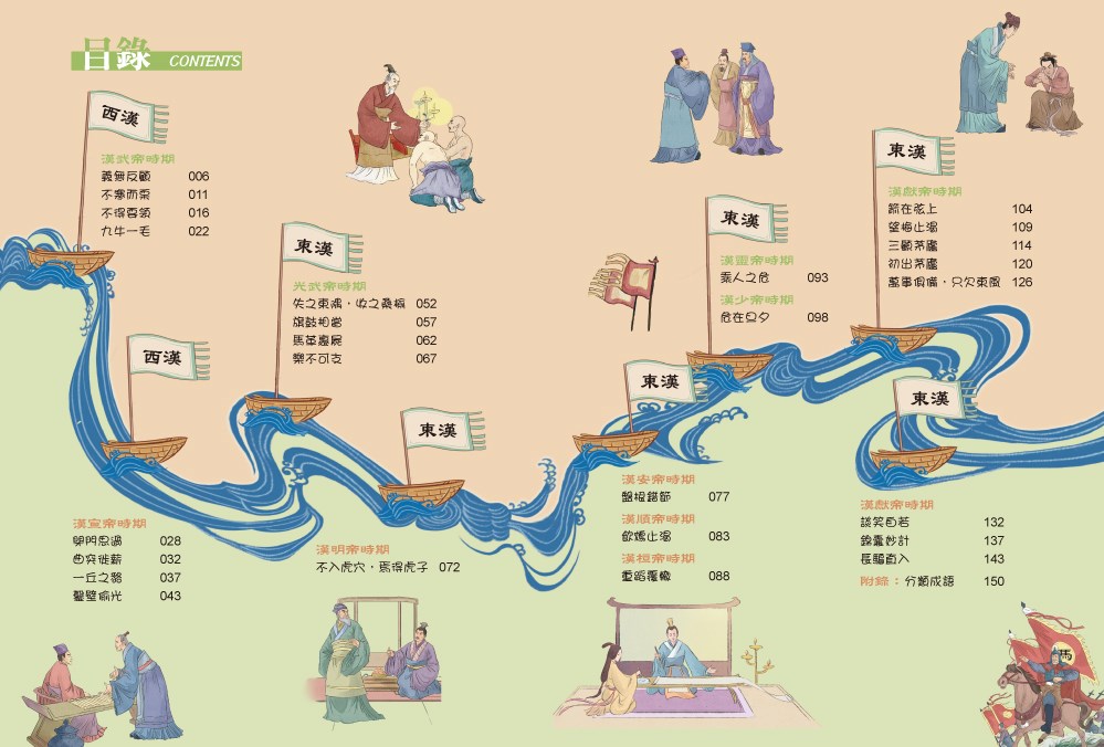 從西漢到東漢,不僅學到一個又一個的成語,歷史架構也依序建立,學會成語的同時,也對歷史事件發生的原因與影響,有更深入的了解。而一篇歷史故事中,還會提及許多其他的成語,一篇故事能讓你認識三個以上的成語。